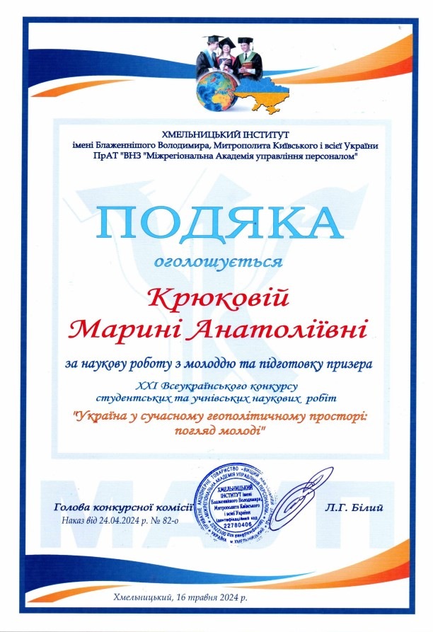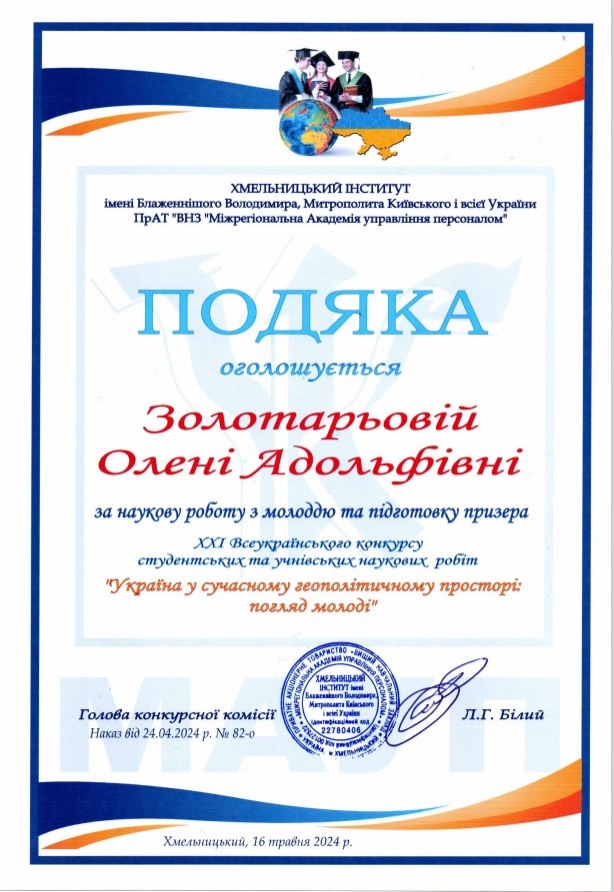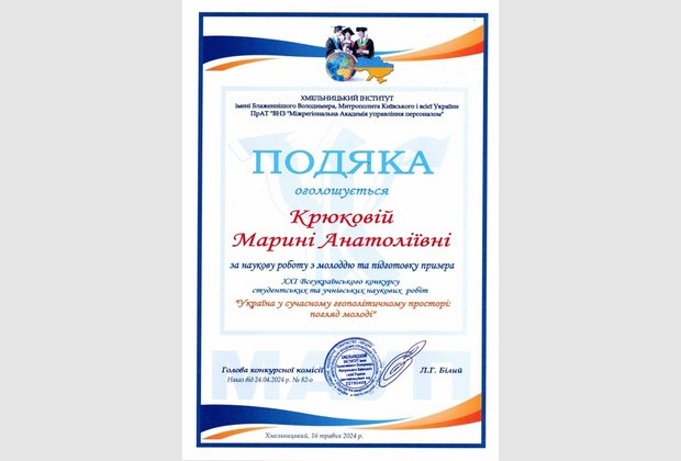 Студенти Одеського інституту МАУП традиційно взяли участь у ХХІ Всеукраїнській науково-практичній конференції «Україна У СУЧАСНОМУ ГЕОПОЛІТИЧНОМУ ПРОСТОРІ: ПОГЛЯД МОЛОДІ» за підсумками Конкурсу студентських та учнівських наукових робіт, яка відбулася 16 травня 2024 року у Хмельницькому інституті МАУП.