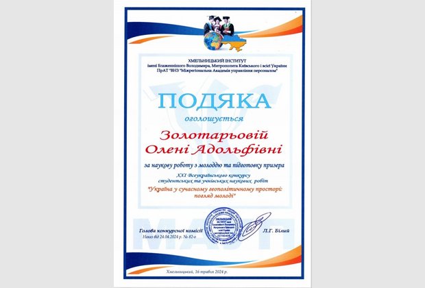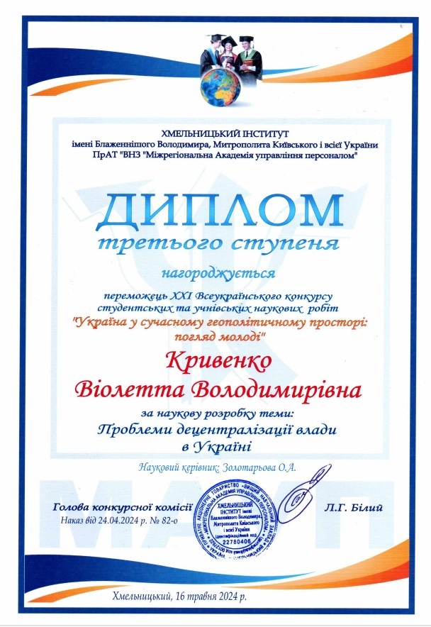 За результатами засідання конкурсної комісії Диплом ІІІ ступеня за наукову розробку теми: «Проблеми децентралізації влади в Україні» отримала Кривенко Віолетта – студентка 2 курсу спеціальності Право; науковий керівник, доцент кафедри права та правоохоронної діяльності Золотарьова О.А. отримала Подяку за наукову роботу з молоддю та підготовку призера;