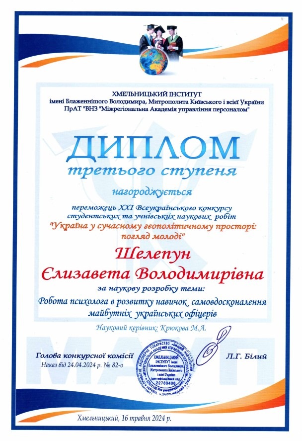 Шелепун Єлизавета – студентка 3 курсу спеціальності Психологія отримала Диплом ІІІ ступеня за наукову тему: «Робота психолога з розвитку навичок самовдосконалення майбутніх українських офіцерів»; науковий керівник: канд.псих.н., доцент Крюкова М.А. отримала Подяку за наукову роботу з молоддю та підготовку призера.