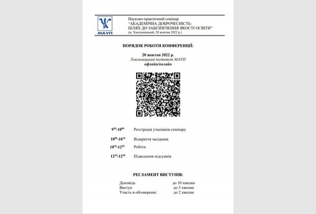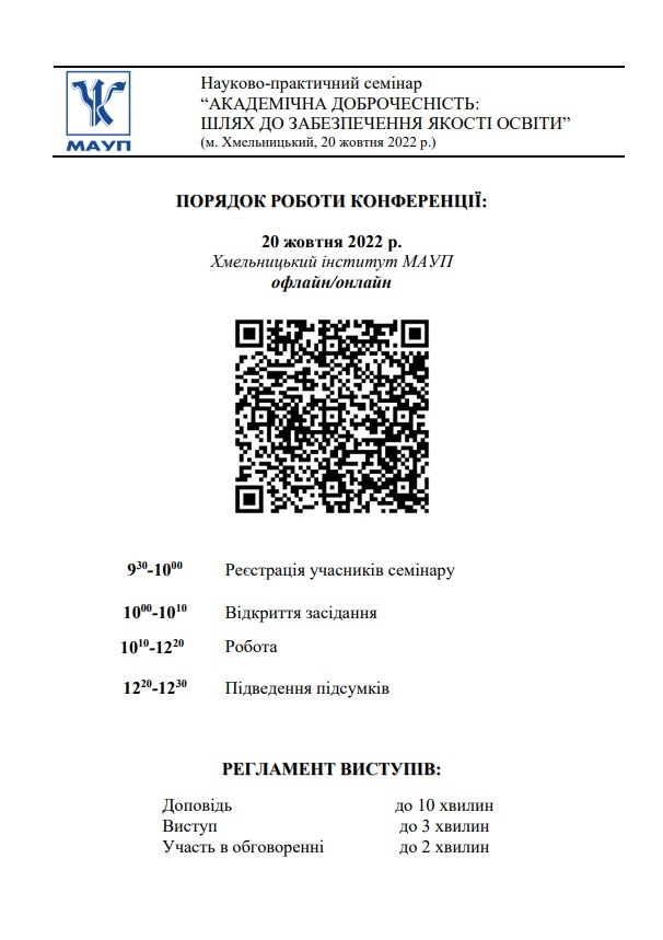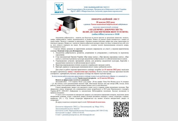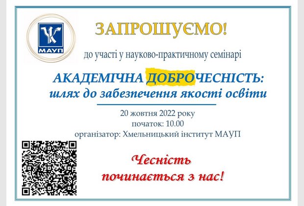 20 жовтня 2022 року у рамках Тижня академічної доброчесності у Хмельницькому інституті МАУП «Академічна доброчесність: шлях до забезпечення якості освіти». У заході взяли участь здобувачі вищої та фахової передвищої освіти, науково-педагогічні працівники: