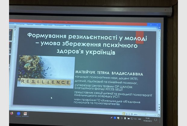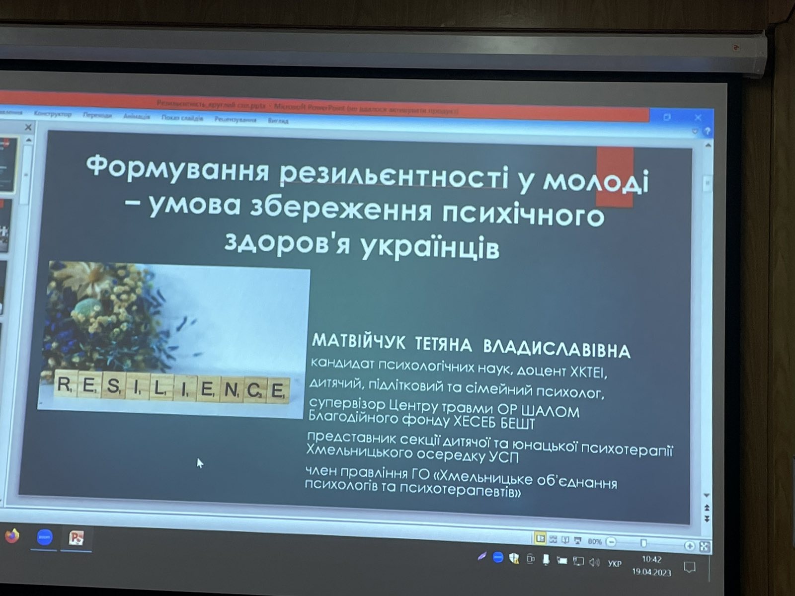 Тетяна Владиславівна Матвійчук, кандидат психологічних наук, доцент, доцент кафедри соціально-гуманітарної та загальноекономічної підготовки Хмельницького кооперативного торговельно-економічного інституту; дитячий, підлітковий та сімейний психолог; супервізор Центру травми ОР ШАЛОМ Благодійного фонду ХЕСЕБ БЕШТ; представник секції дитячої та юнацької психотерапії Хмельницького осередку УСП; Член правління ГО «Хмельницьке об’єднання психологів та психотерапевтів у своєму виступі розповіла про формування резильєнтності в молоді – умова збереження психічного здоров’я українців.