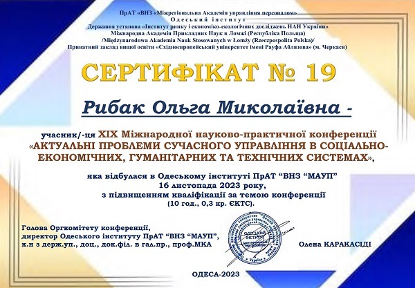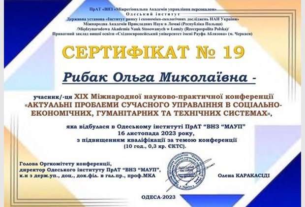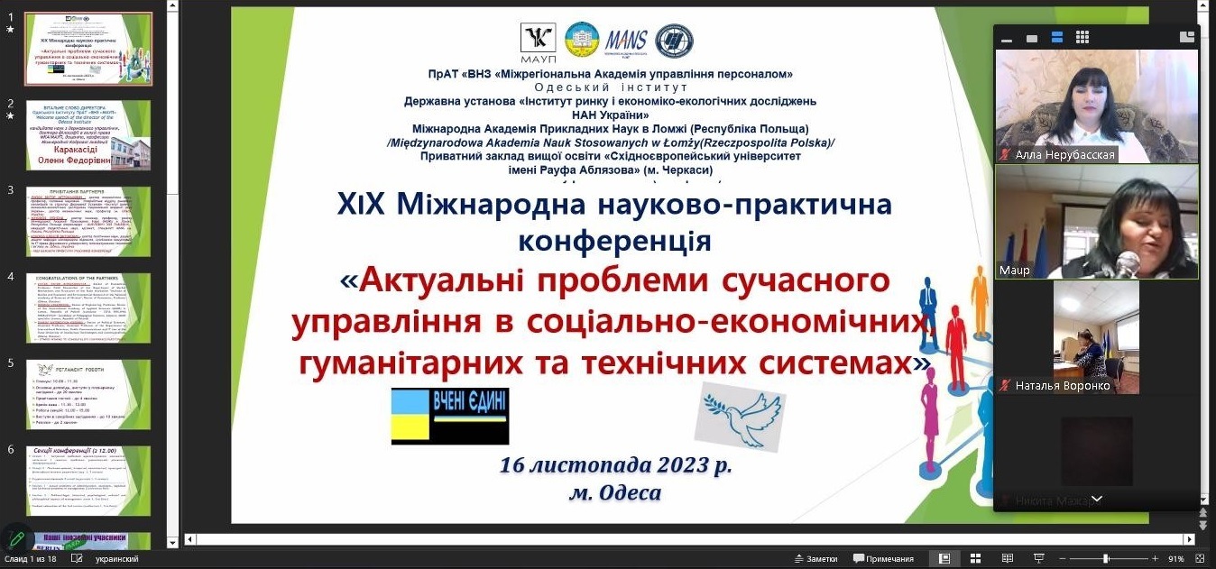 В Одеському інституті МАУП відбулася ХІХ щорічна Міжнародна науково-практична конференція "Актуальні проблеми сучасного управління в соціально-економічних, гуманітарних та технічних системах", співорганізаторами якої стали Державна установа "Інститут ринку і економіко-екологічних досліджень НАН України", Міжнародна Академія Прикладних Наук в Ломжі (Республіка Польща), Приватний заклад вищої освіти "Східноєвропейський університет імені Рауфа Аблязова" (м. Черкаси).