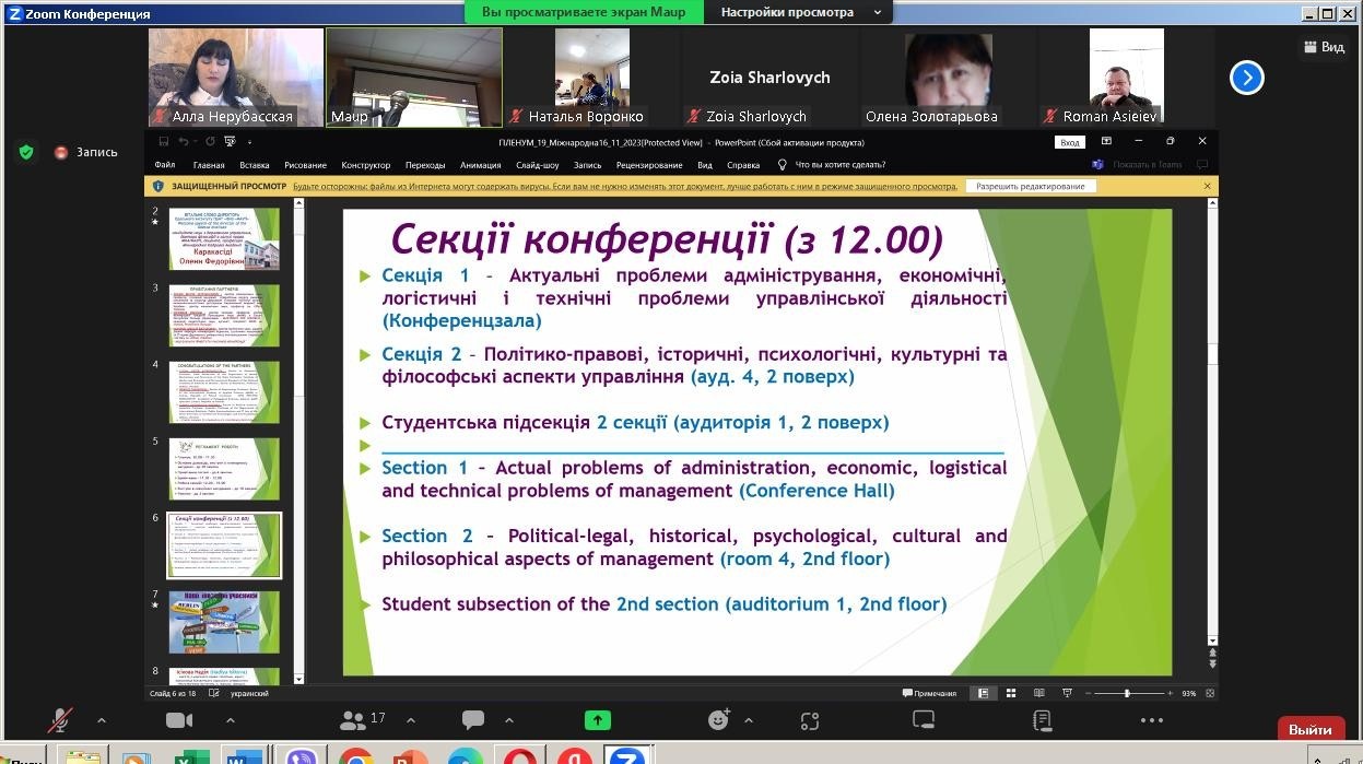 В перерві для брейк-кави учасники зробили фото на пам'ять, після перерви роботу продовжено в трьох секціях, з яких одна студентська. Обговорено актуальні проблеми управлінської діяльності в різних сферах, питання євроінтеграції, воєнного стану, судової реформи, верховенства права, розвитку культури, роль пробації, різні напрямки психологічної науки. Конференція пройшла в змішаному форматі, до учасників долучились як слухачі більше 50 студентів і викладачів.