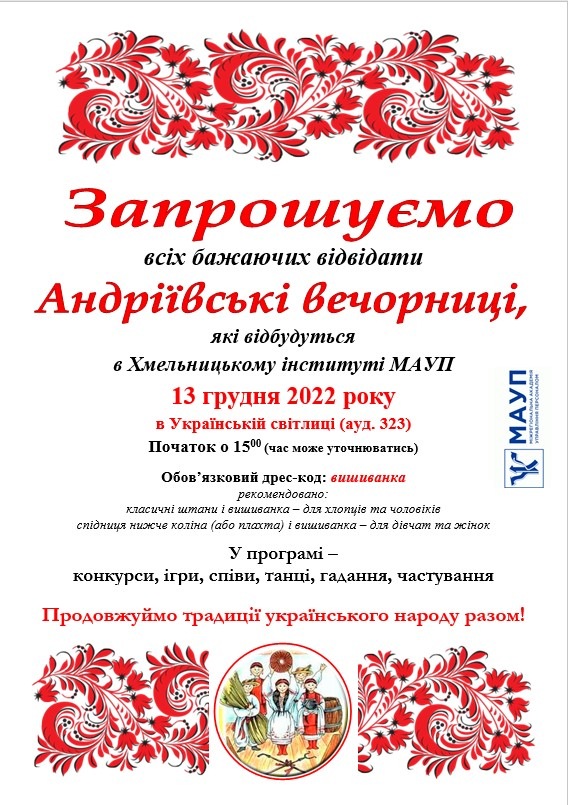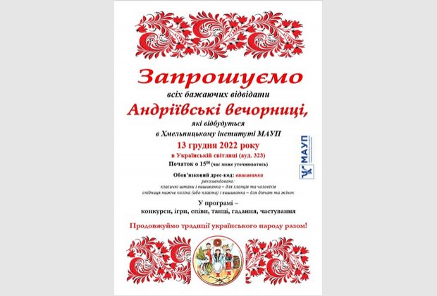 13 грудня у День святого Андрія Первозванного у Хмельницькому інституті МАУП відбулися Андріївські вечорниці. Свято перервала повітряна тривога, але це не завадило після її завершення продовжити дійство.