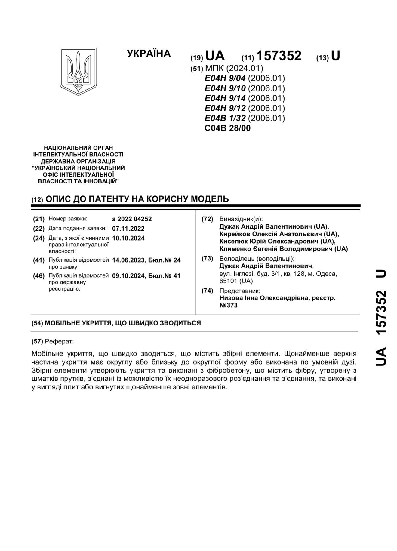 Аспірант кафедри публічного адміністрування МАУП заочної форми навчання Олексій Кірейков зареєстрував патент на корисну модель - «Мобільне укриття»! Мобільне укриття, що швидко зводиться, що містить збірні елементи. Щонайменше верхня частина укриття має округлу або близьку до округлої форму або виконана по умовній дузі. Збірні елементи утворюють укриття та виконані з фібробетону, що містить фібру, утворену з шматків прутків, з’єднані із можливістю їх неодноразового роз’єднання та з’єднання, та виконані