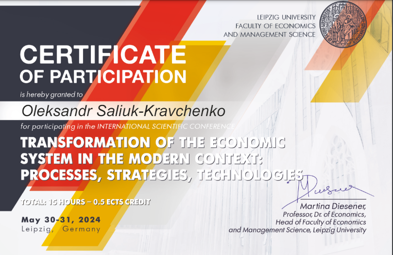 Докторант кафедри публічного адміністрування МАУП Олександр Салюк-Кравченко успішно апробував результати досліджень у ході низки міжнародних науково-практичних конференцій. З апробаціями та опублікованими автором матеріалами запрошуємо ознайомитися за покликаннями:1. Saliuk-Kravchenko O.O. Toolset for public administration mechanisms within the framework of Ukraine energy security assurance during the period of martial law. International Scientific Conference Transformation processes of the economic system in the context of modern challenges: Conference Proceedings (February 2–3, 2024. Klaipeda, Lithuania). Riga, Latvia: Baltija Publishing, 2024. – 292 p. – pp. 237-240. DOI: DOI: https://doi.org/10.30525/978-9934-26-398-9-64. 2. Saliuk-Kravchenko O.O. Specifics of Ukrainian fuel and energy complex reforming mechanisms in public administration. International Scientific Conference Innovation and investment mechanisms for the development of international relations and market economy: Conference Proceedings (April 5–6, 2024. Kielce, Poland). Riga, Latvia: Baltija Publishing, 2024. – 172 p. – pp. 120-123. DOI: https://doi.org/10.30525/978-9934-26-417-7-33. 3. Saliuk-Kravchenko O.O. Mechanism of public administration of the renewable energy sector implemented to ensure state’s energy security. International Scientific Conference Transformation of the Economic System in the Modern Context: Processes, Strategies, Technologies: Conference Proceedings (May 30-31, 2024. Leipzig, Germany). Riga, Latvia: Baltija Publishing, 2024. – 128 p. – pp. 99-102. DOI: https://doi.org/10.30525/978-9934-26-447-4-26.