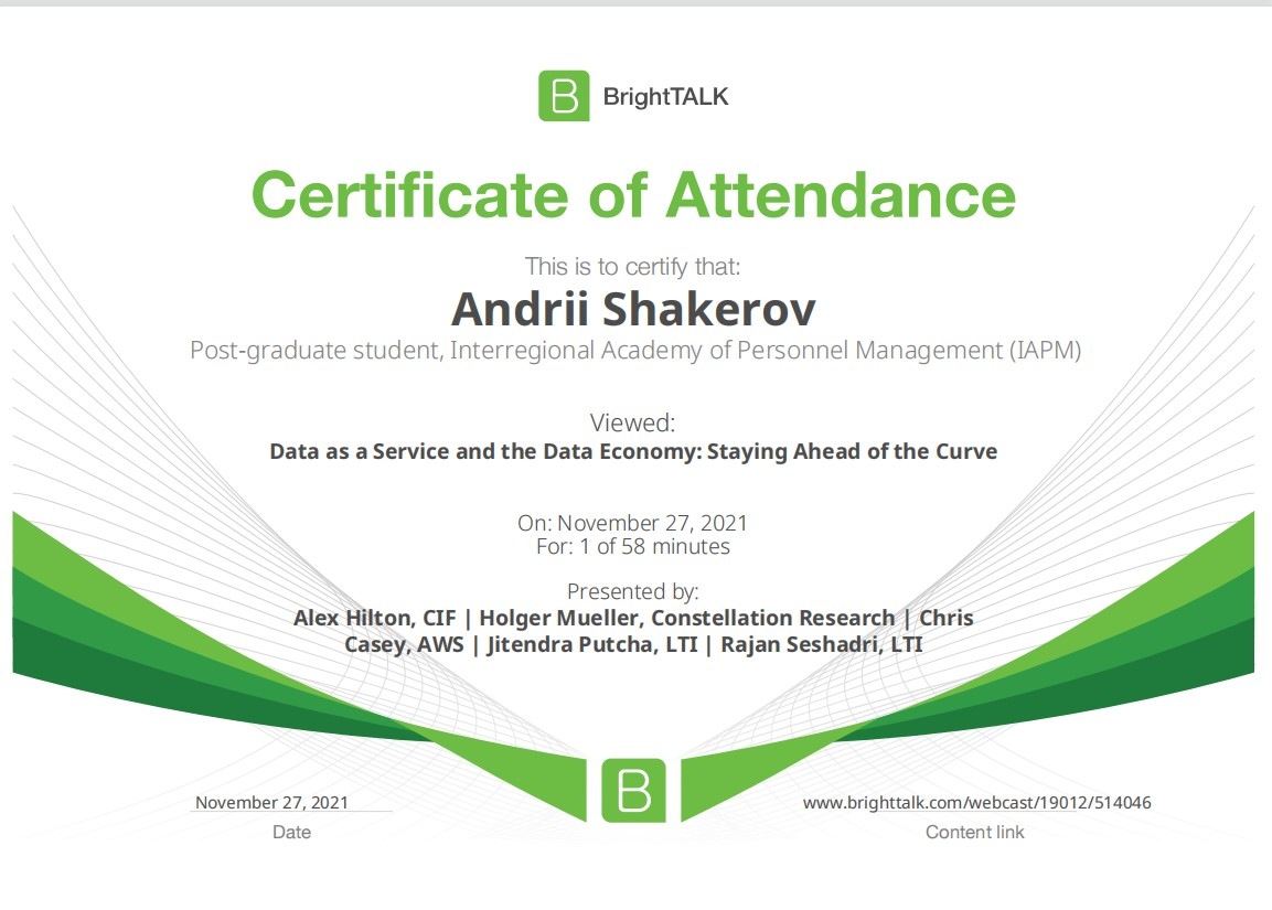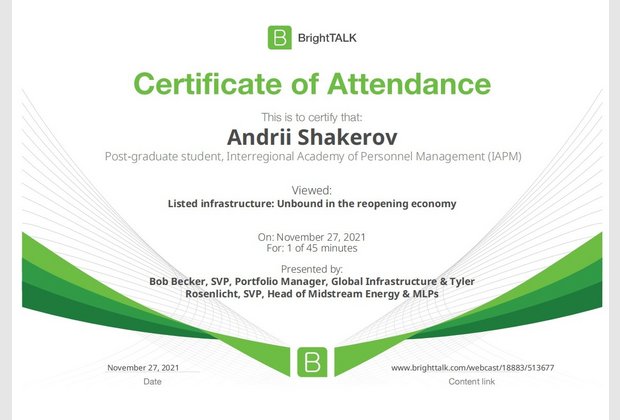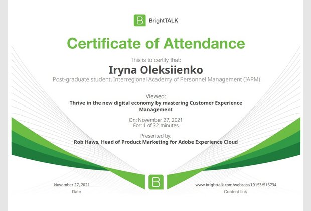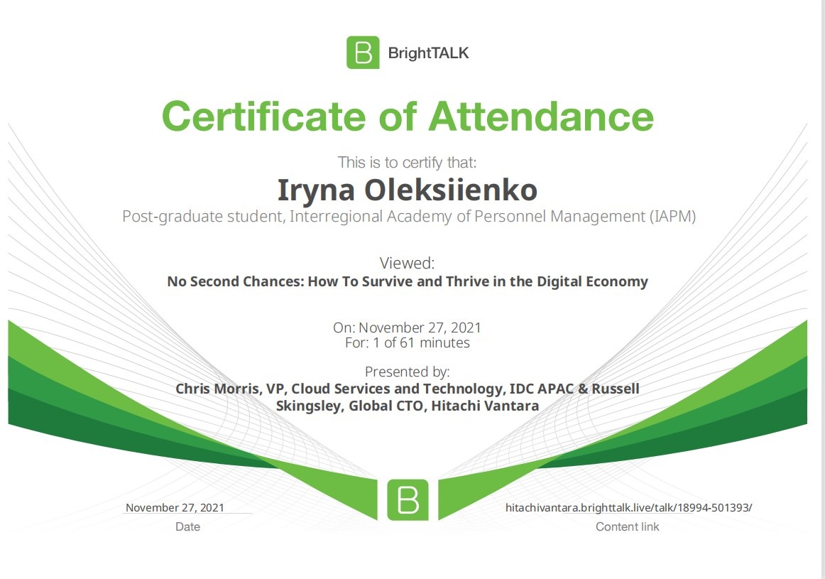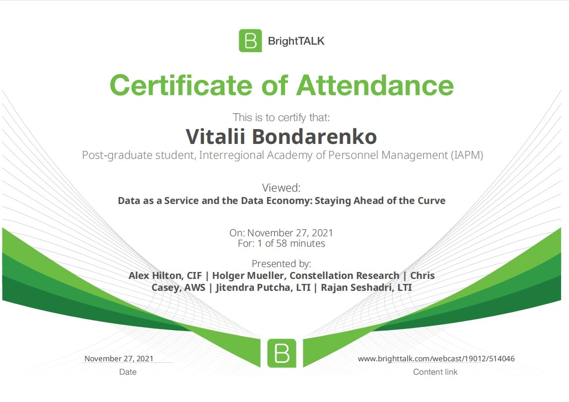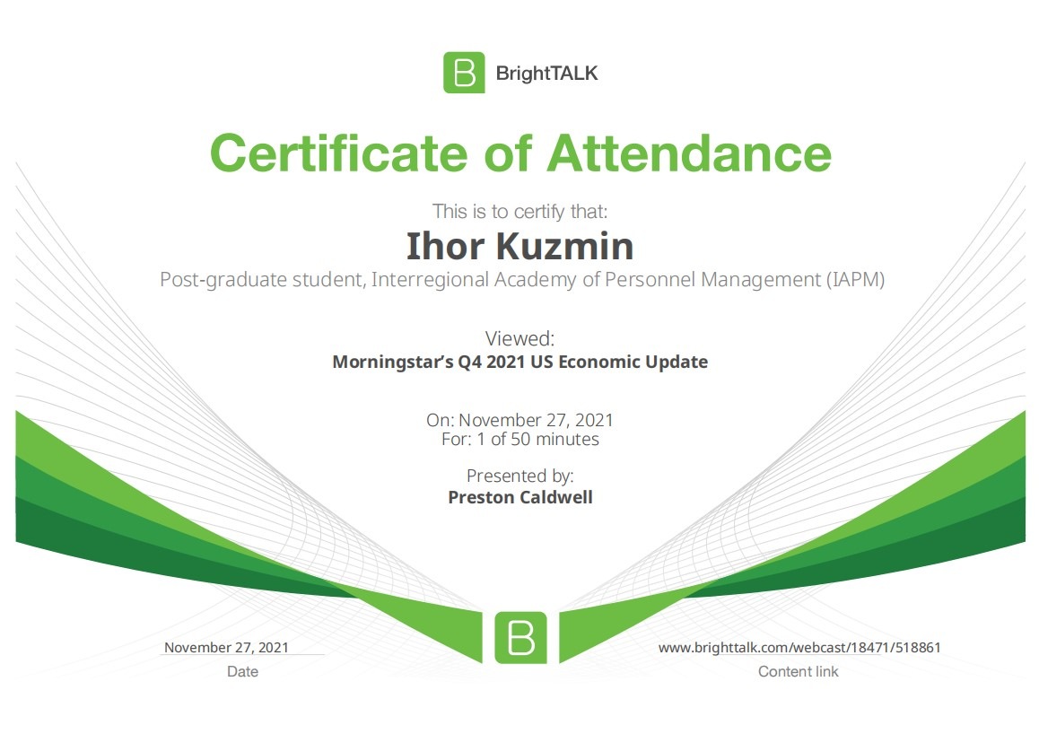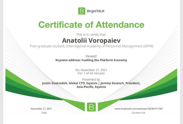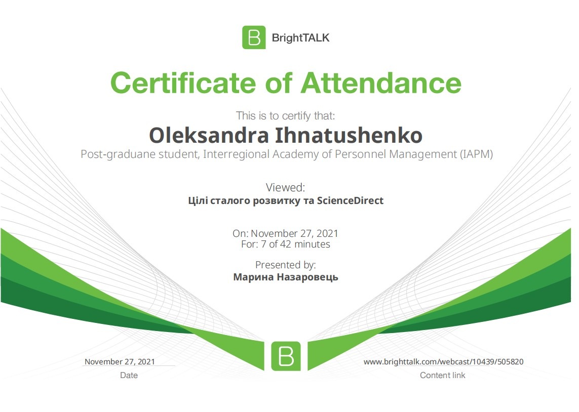 26 та 27 листопада здобувачі освітньо-наукової програми "Економіка" ННІУЕБ долучилися до Марафону неформальної освіти. Участь у заході передбачала прослуховування та роботу із кількома вебінарами англійською та українською мовами на освітньо-науковій платформі BrightTALK. Викладачі ОНП були приємно вражені активністю наших аспірантів. За результатами такого неформального навчання молоді дослідники отримають можливість визнання результатів навчання на платформі BrightTALK як зарахування вивчених окремих тем/модулів зі змісту дисциплін освітньої складової ОНП.