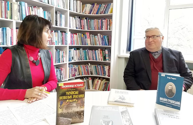 Модератор заходу, ведучий співробітник бібліотеки, Утиро Н.О. поставила низку питань кандидату історичних наук, завідувачу кафедри загальнонаукових, соціальних та поведінкових дисциплін Чернігівського інституту імені Героїв Крут ПрАТ "ВНЗ" МАУП" Ямпольцю П.В.
