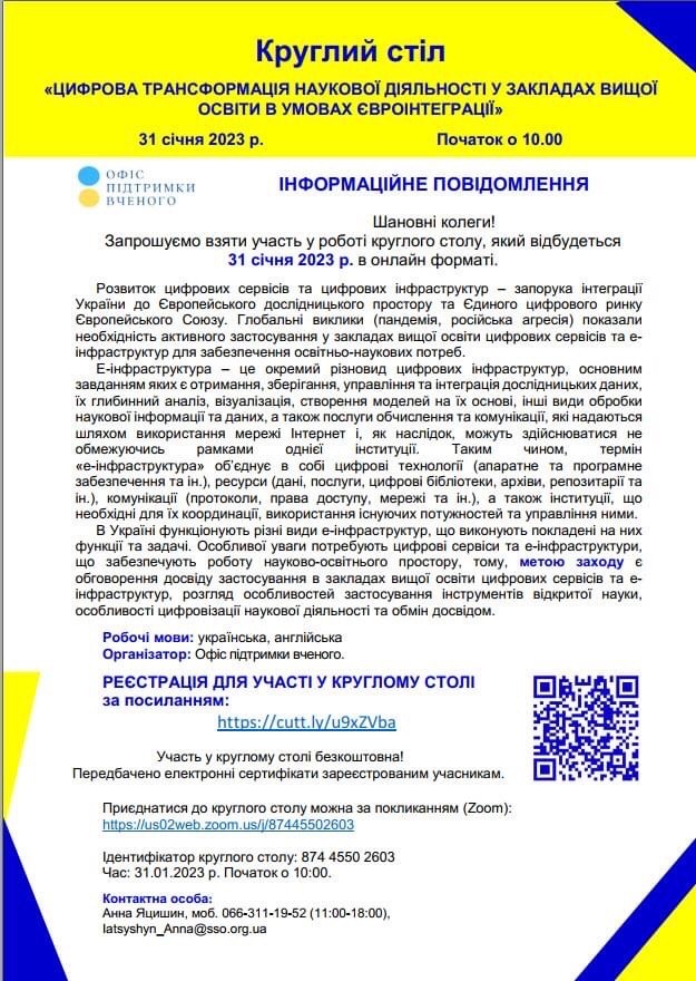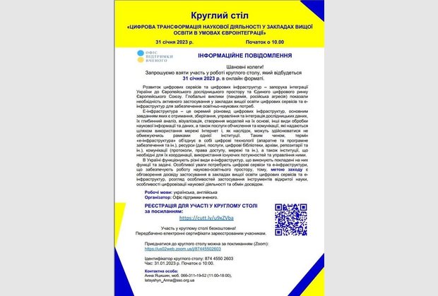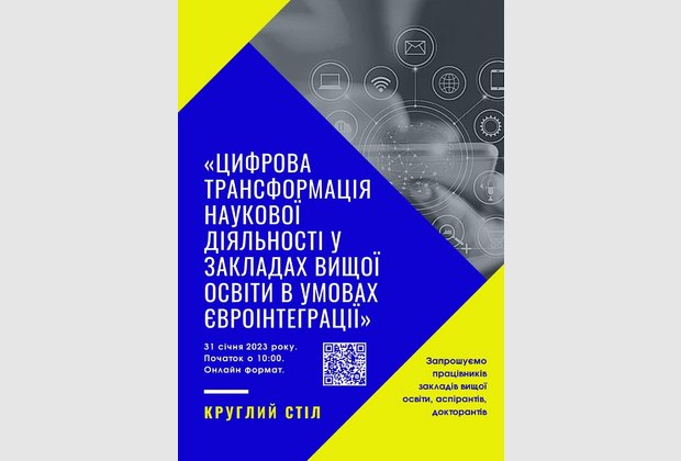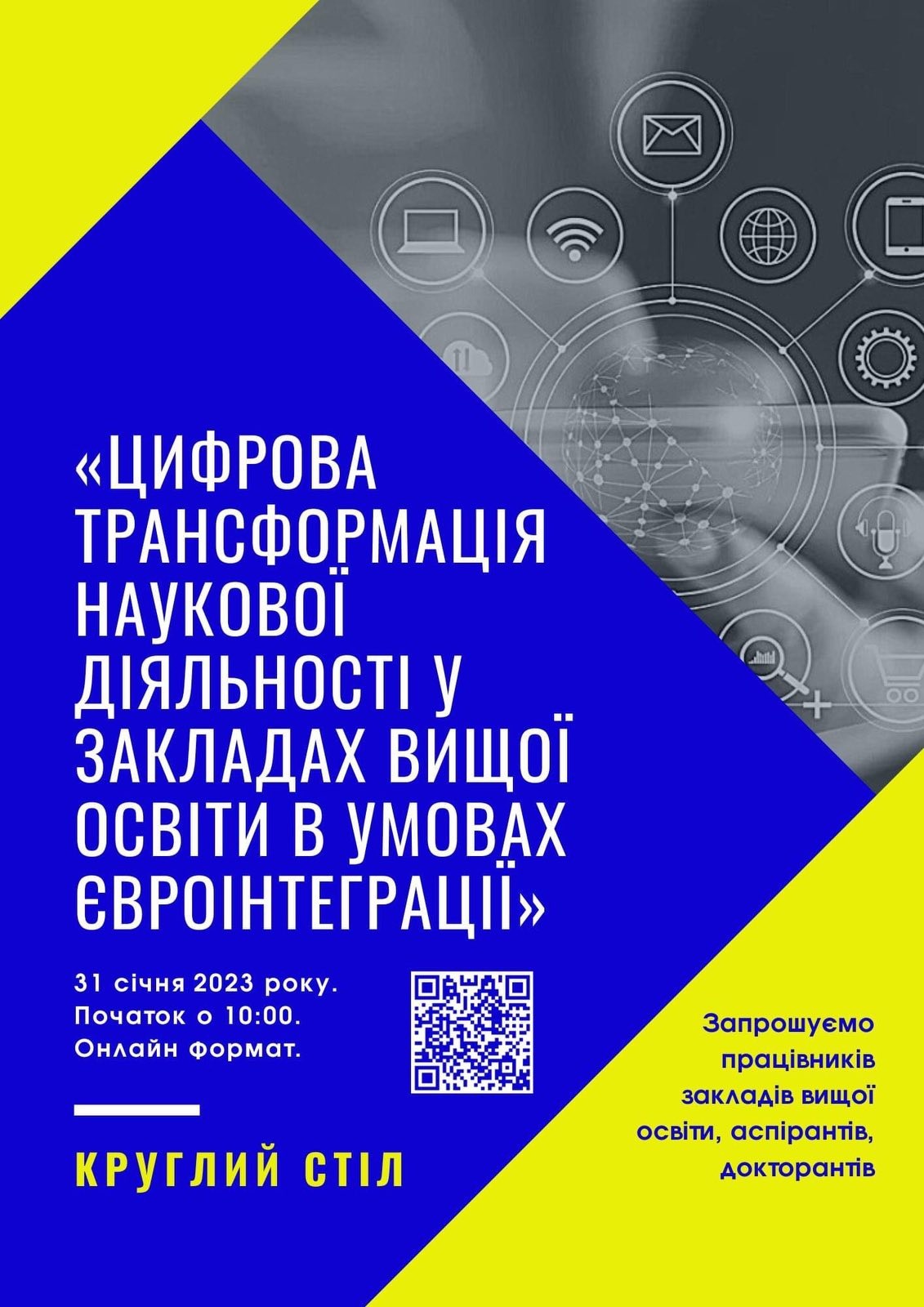 31 січня 2023 року в онлайн-форматі відбувся круглий стіл на тему «Цифрова трансформація наукової діяльності у закладах вищої освіти в умовах євроінтеграції» у якому взяли участь науково-педагогічні працівники Хмельницького інституту МАУП.