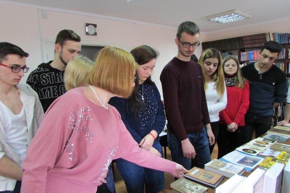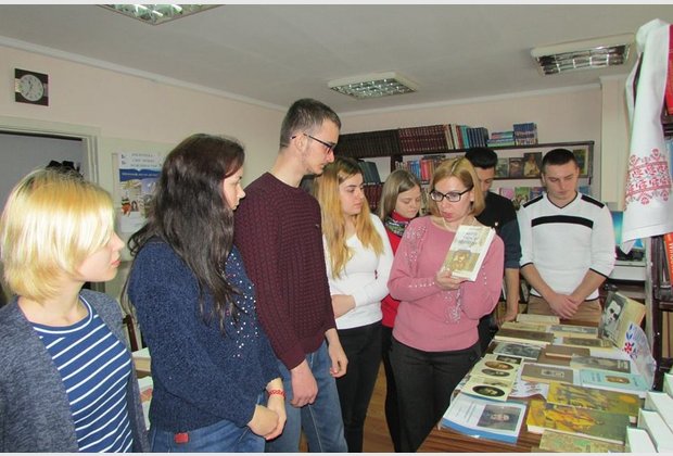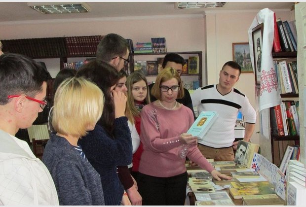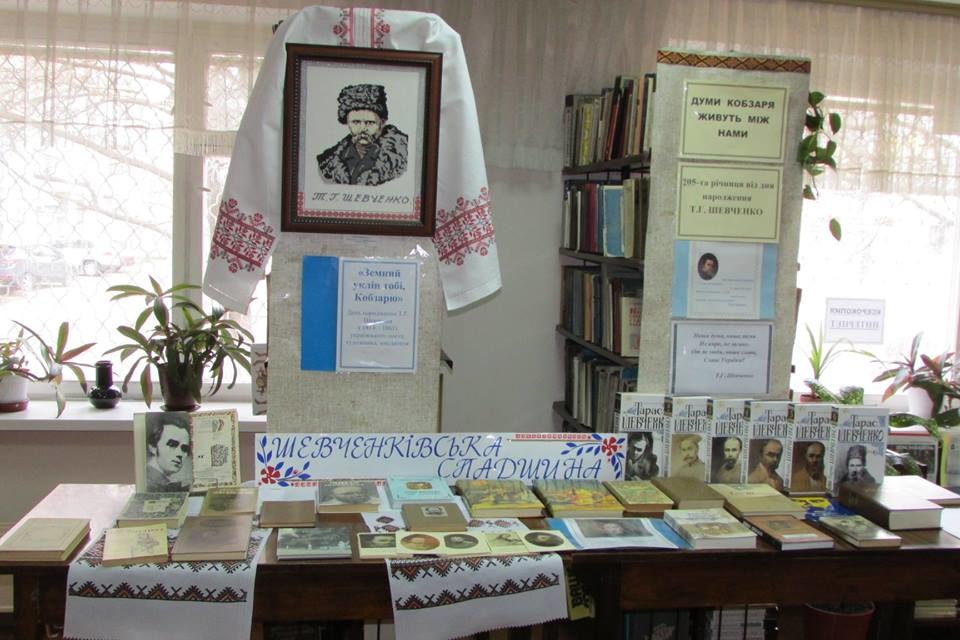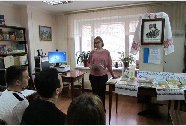 Завідувач філією С. П. Косійчук провела огляд книжкової виставки «Лунає струна Кобзаревого слова», на якій представлені художні твори Тараса Шевченка, літературно-критична та публіцистична література про його життя і творчість, запропонувала студентам для творчої роботи та навчання тематичну добірку статей, рекомендувала анотований список літератури з фонду бібліотеки-філії.