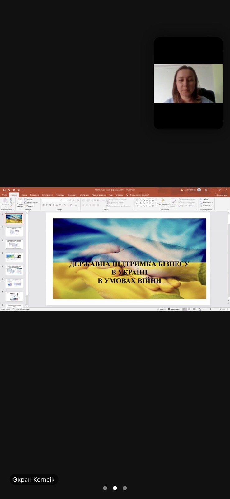 Про державну підтримку бізнесу в Україні в умовах війни доповіла Кришталь Галина Олександрівна, доктор економічних наук, професор, завідувач кафедри фінансів, банківської та страхової справи Навчально-наукового інституту управління, економіки та бізнесу Міжрегіональної Академії управління персоналом;