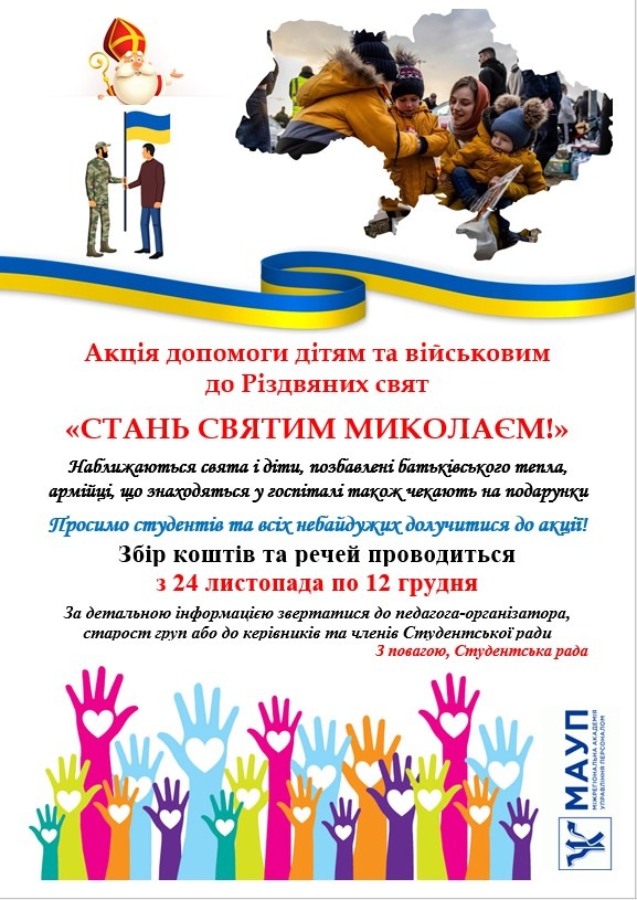 Студентська рада Хмельницького інституту МАУП у цьому році вирішила стати для бійців української армії та дітей-сиріт Святим Миколаєм. Протягом грудня студенти реалізували ряд волонтерських проєктів. Зараз в першу чергу всі зусилля спрямовані на допомогу Українській Армії, але ми не повинні забувати, що у нас є діти-сироти і на превеликий жаль зараз їх стало набагато більше. У життя стількох українських дітей війна увійшла своїм жахіттям. Стільки дітей пережили бомбардування, були свідками бойових дій, бачили те, чого би діти ніколи не мали бачити… Частина дітей втратили рідних…