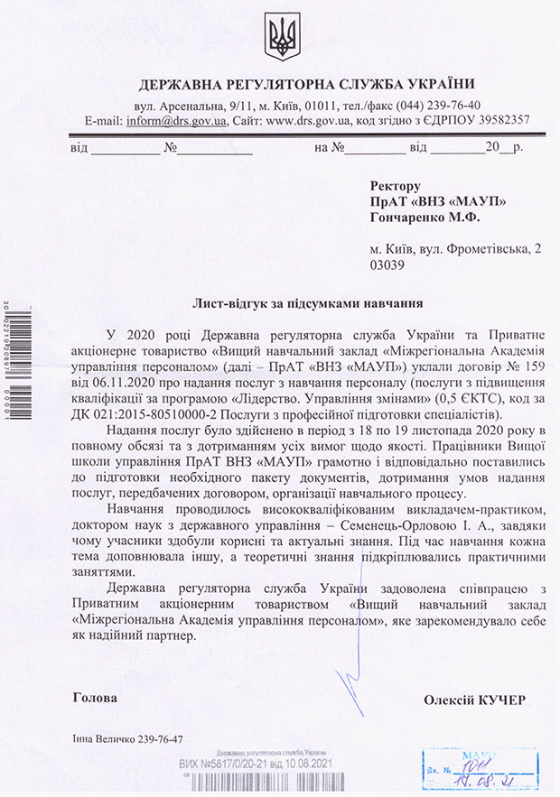 Державна регуляторна служба України висловила вдячність ПрАТ «Вищий навчальний заклад «Міжрегіональна Академія управління персоналом» та доктору наук з державного управління Семенець-Орловій Інні Андріївні за співпрацю та надання навчальних послуг з підвищення кваліфікації за програмою «Лідерство. Управління змінами», завдяки чому учасники отримали корисні та актуальні знання.