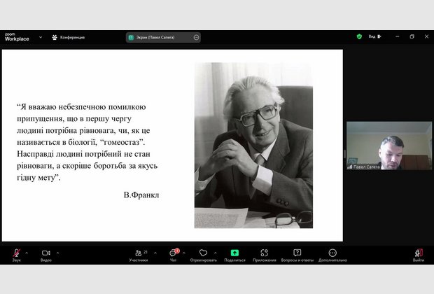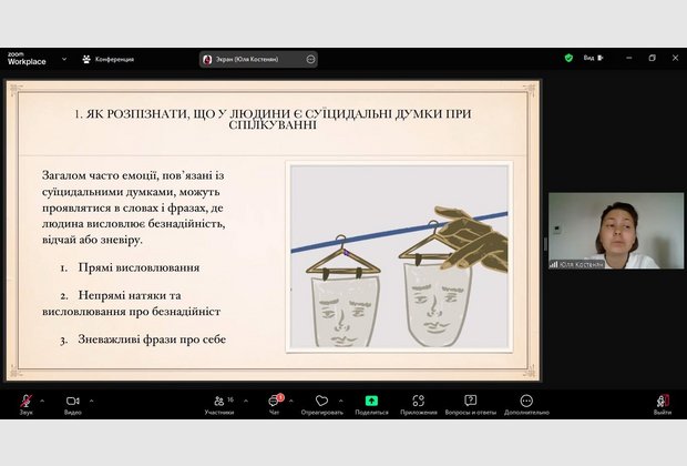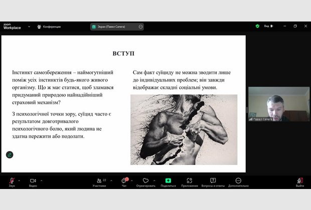 20.11.2024 р. Павло Сапега, студент 4 курсу спеціальності Психологія Одеського інституту ПрАТ «ВНЗ «МАУП» та науковий керівник, д.ф.н., доц., зав.кафедри Алла Нерубасська презентували тему «Динаміка суїциду в психоаналітичній перспективі внутрішньо особистісного конфлікту» у розширеному засіданні студентського наукового гуртка «ORDO AMORIS» та кафедри психології Мелітопольського державного педагогічного університету ім. Б. Хмельницького присвяченого обговоренню проблеми суїциду та шляхів його подолання. До участі у засіданні також були запрошені студенти Глухівського державного педагогічного університету імені О. Довженка