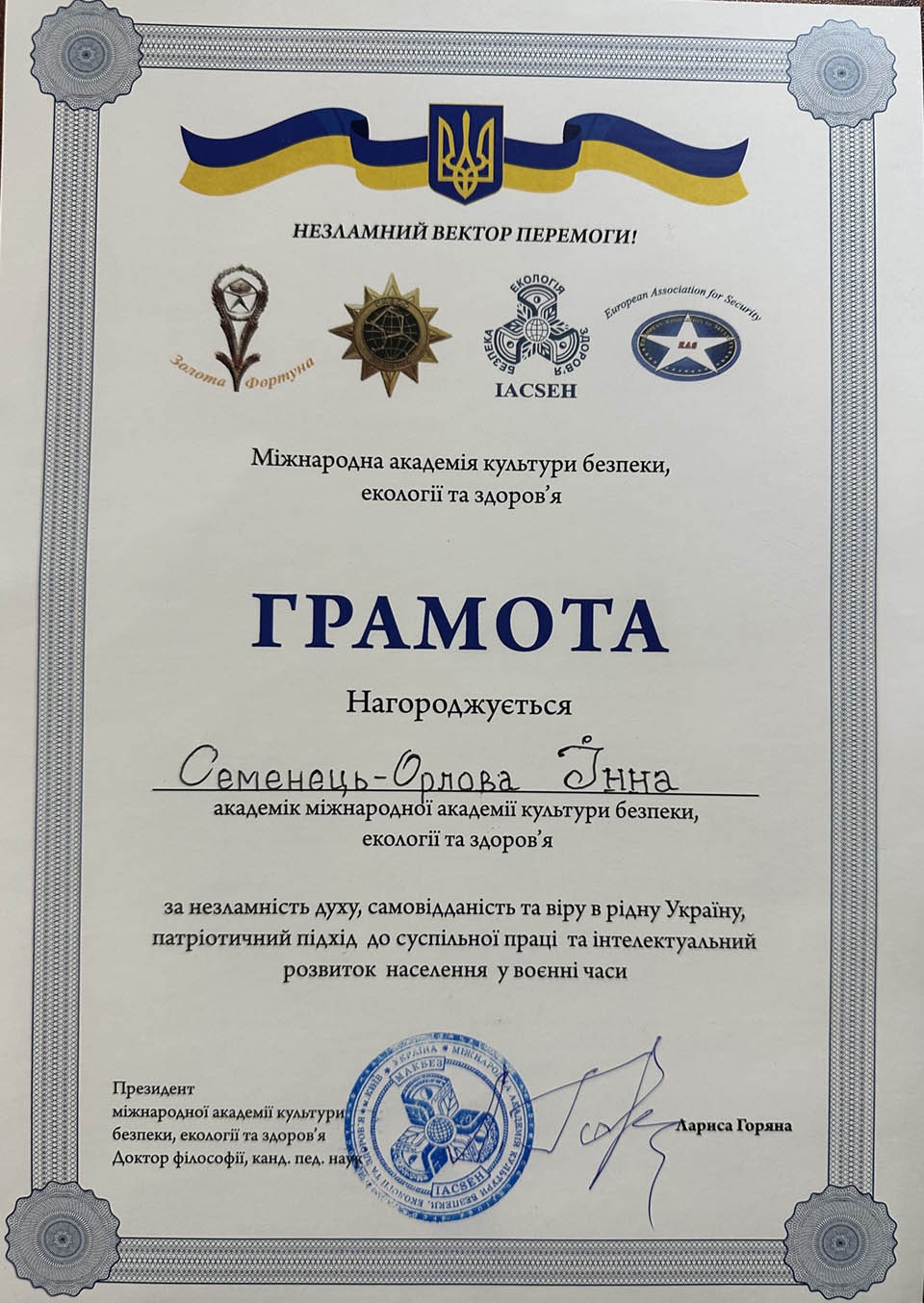 Семенець-Орлову І.А., директора Навчально-наукового інституту управління, економіки та бізнесу нагороджено Грамотою Міжнародної академії культури безпеки, екології та здоров'я. У Грамоті відзначено внесок І.А.Семенець-Орлової у розвиток громадянської освіти, зокрема патріотичний підхід до суспільної праці та інтелектуальний розвиток населення у воєнні часи, незламність духу, самовідданість та віру в рідну Україну.
