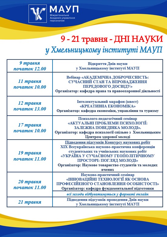 З 9 по 21 травня 2022 року в Хмельницькому інституті МАУП триватимуть Дні науки – найважливіша наукова подія Інституту.