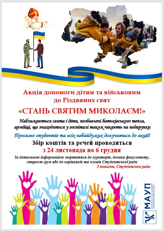 Доброчинна акція «Стань Святим Миколаєм» - це добра традиція Інституту, яка щороку до Дня Святого Миколая об’єднує студентську спільноту навколо щирого бажання підтримати дітей із сімей, що перебувають у складних життєвих обставинах. Її головна мета - подарувати дітям не лише подарунки, а передусім відчуття турботи, безпеки та людського тепла, яке так необхідне кожній дитині, особливо у передсвятковий зимовий час.