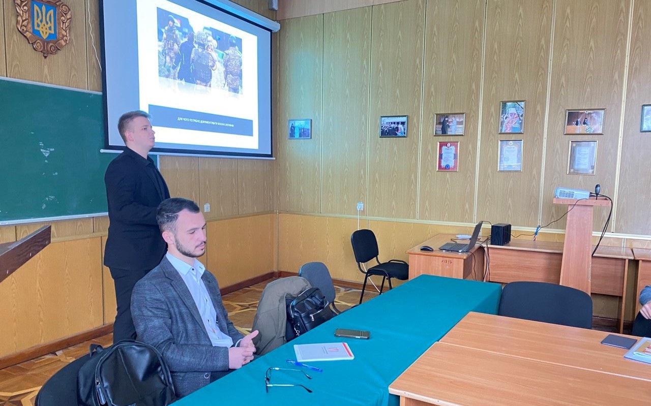 Володимир Шинкар, юрист, документатор ГО «Подільська правова ліга» та Руслан Малий, юрист Української Гельсінської спілки з прав людини, адвокат, юрист ГО «Подільська правова ліга» із застосуванням практичних кейсів довели студентам поняття воєнних злочинів, особливості відповідальності за них, процедуру документування фактів.
