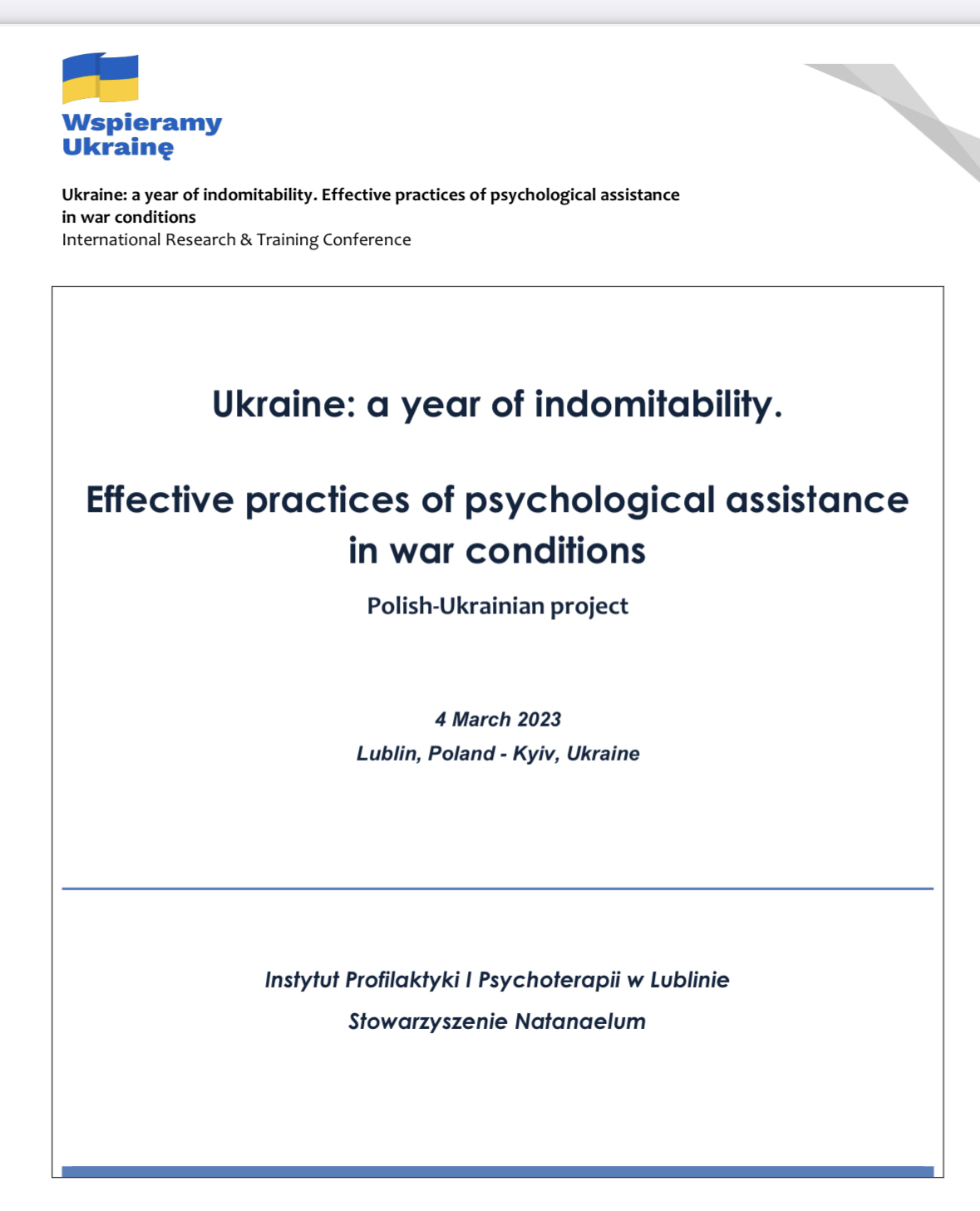 Вийшов друком збірник тез за результатами конференції в рамках міжнародного проєкту: https://www.natanaelum.pl/ images/aktualnosci/Conference% 20proceedings%202023-Lublin-3. pdf. Проєкт «Підготовка фахівців для надання ефективної психологічної та соціальної допомоги українцям, постраждалим від війни» реалізовано в рамках Програми «Ми підтримуємо Україну», створеної Польсько-Американською Фундацією Свободи. У роботі проєкту брала участь директор Навчально-наукового інституту управління, економіки та бізнесу І.А. Семенець-Орлова.