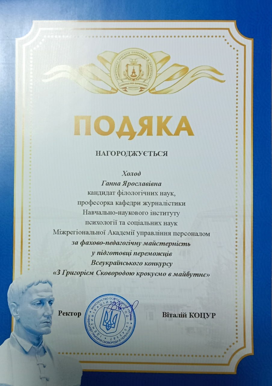 Подвійну подяку за успішну підготовку своїх учениць до участі в конкурсах заслужила Ганна Ярославівна Холод, кандидат філологічних наук, професорка кафедри журналістики.