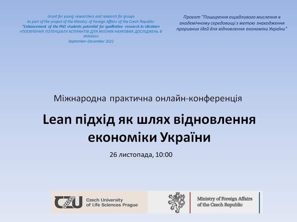 Проєкт «Поширення ощадливого мислення в академічному середовищі з метою знаходження проривних ідей для відновлення економіки України» фінансується за рахунок субгранту від Чеського університету природничих наук в Празі за підтримки Міністерства закордонних справ Чеської республіки.