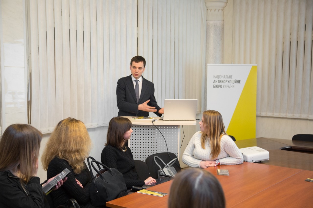 Організатори для початку провели презентацію, де коротко розповіли, як було створено НАБУ, його структуру та особливості його діяльності. Після закінчення презентації у студентів була можливість поспілкуватися з одним із детективів, який був відкритим та чесним у своїх відповідях на запитання. Довершило це дійство невеличка вікторина, спрямована на перевірку уважності слухачів презентації. Переміг у ній та отримав від співробітників Бюро пам’ятні призи Голова Студентської Ради Інституту Права Іконніков Сергій, який набрав найбільшу кількість балів серед студентів.