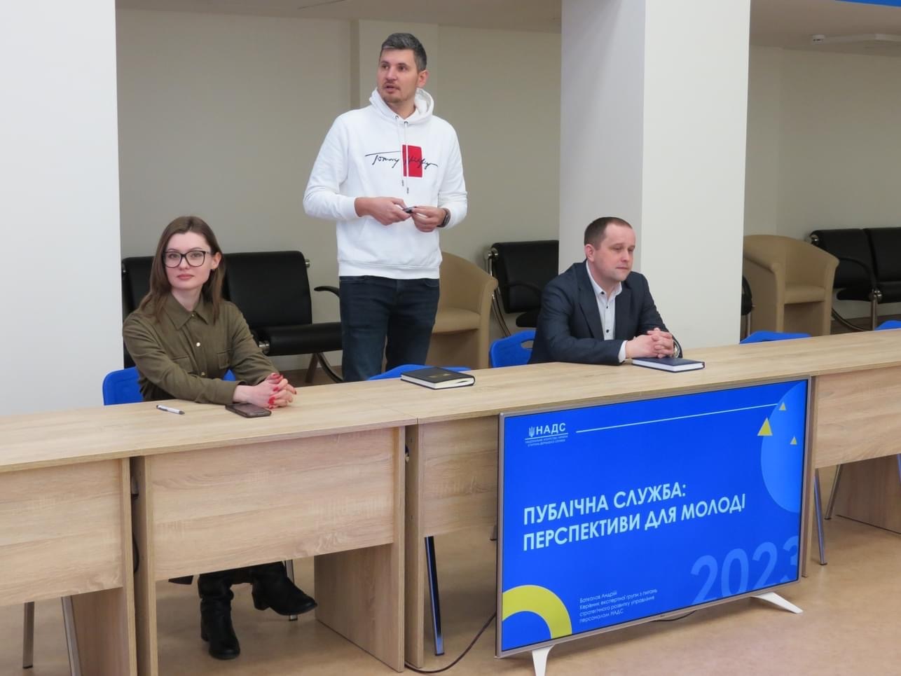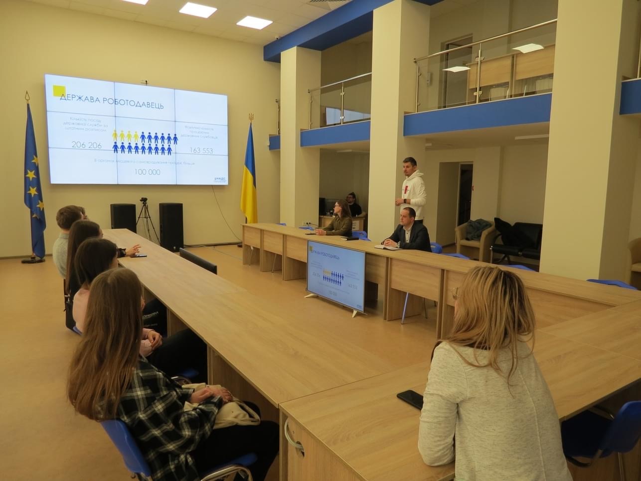 Працівники НАДС розповіли, як стати частиною команди Агентства, як, власне, відбувається стажування в органах державної влади та місцевого самоврядування, які переваги такий інструмент дає молодим фахівцям. Студенти дізналися про процедури вступу на державну службу та отримання державного сертифіката про рівень володіння державною мовою. Аби підвищити кількість молоді в органах державної влади, в Агентстві працюють за двома напрямками. Перший – комунікація і поширення інформації про публічну службу. Приміром, в НАДС щороку проводять «Промодень на публічній службі». Його мета – популяризація публічної служби серед молоді та підвищення рівня обізнаності про роботу службовців. Експертами НАДС у співпраці з партнерами створено освітній серіал, покликаний розширити знання про систему органів влади в Україні. Другий напрямок – навчання фахівців з управління персоналом алгоритмам роботи з молоддю. Зокрема, НАДС розроблено методичні рекомендації щодо стажування у державних органах молоді, яка не перебуває на посадах публічної служби.