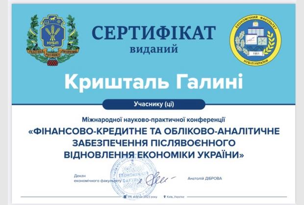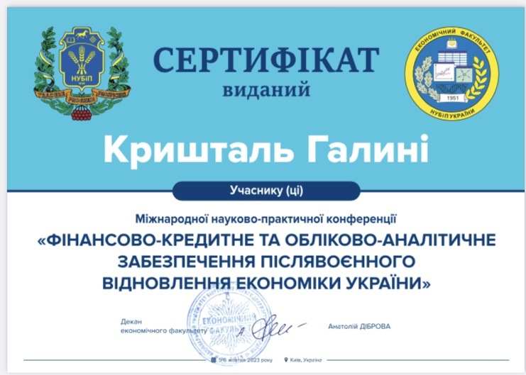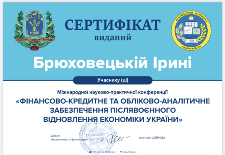 Участь в Міжнародній науково-практичній конференції «Фінансово-кредитне та обліково-аналітичне забезпечення післявоєнного відновлення економіки України»