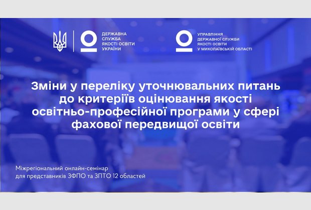 Державною службою якості освіти та територіальними органами Служби у Миколаївській, Дніпропетровській, Донецькій, Житомирській, Кіровоградській, Луганській, Сумській, Тернопільській, Харківській, Хмельницькій, Черкаській, Чернігівській областях проведено міжрегіональний онлайн-семінар для закладів фахової передвищої та професійної (професійно-технічної) освіти 12 областей.