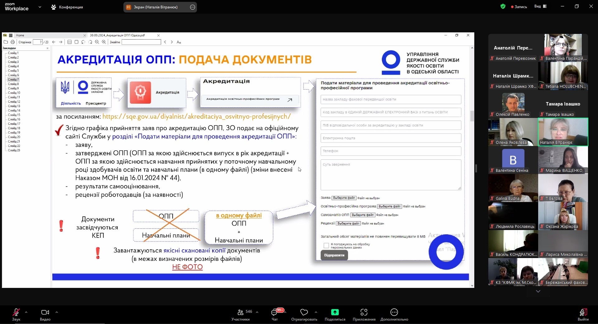 Начальниця управління Державної служби якості освіти у Миколаївській області Тетяна ГОЛУБЧЕНКО наголосила, що акредитаційна експертиза ОПП у сфері фахової передвищої освіти є ключовим інструментом зовнішнього забезпечення якості фахової передвищої освіти в Україні. Напрацьовані Державною освітньою установою «Навчально-методичний центр з питань якості освіти» у співпраці з Державною службою якості освіти України зміни дозволять удосконалити організацію процедури оцінювання.