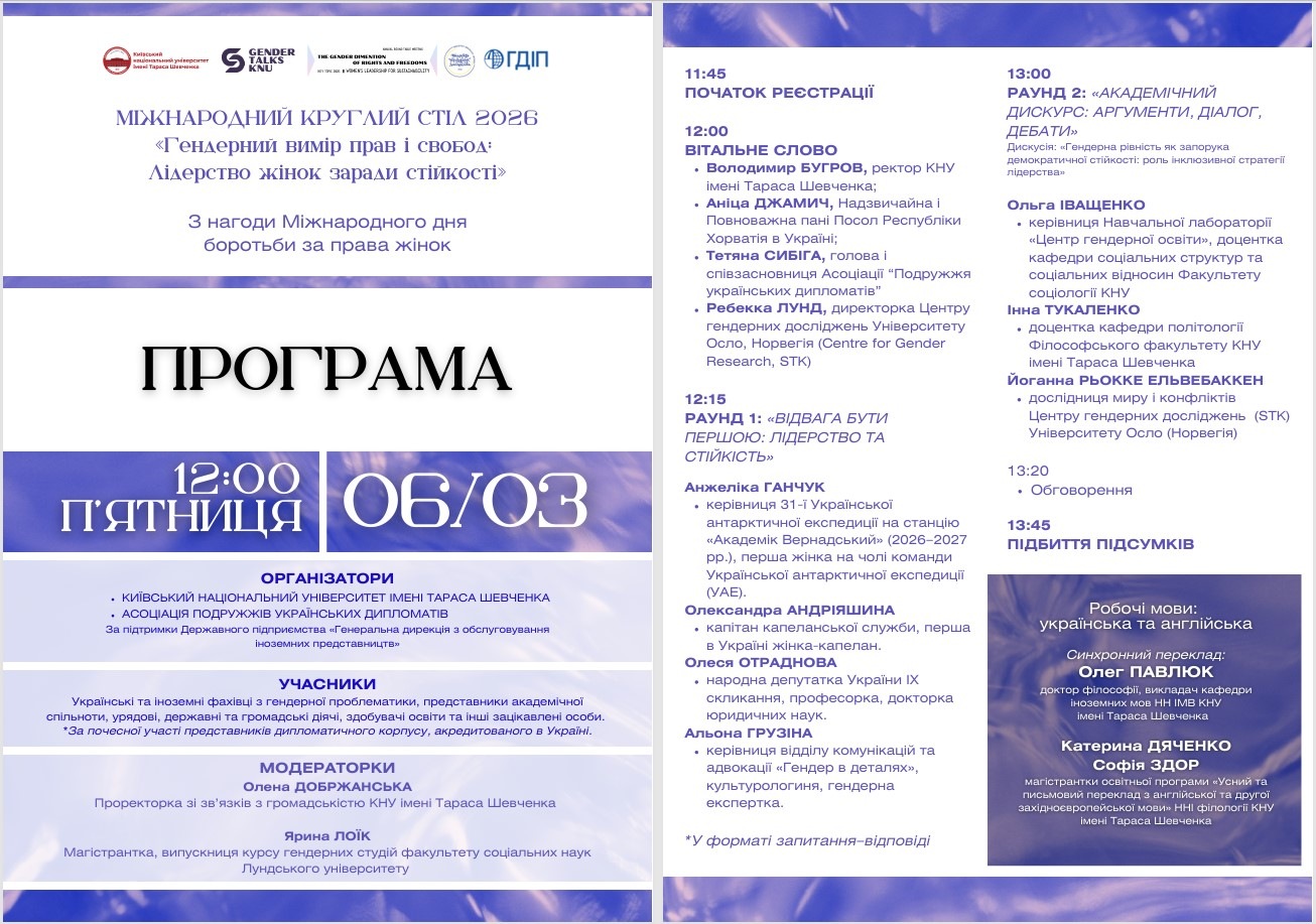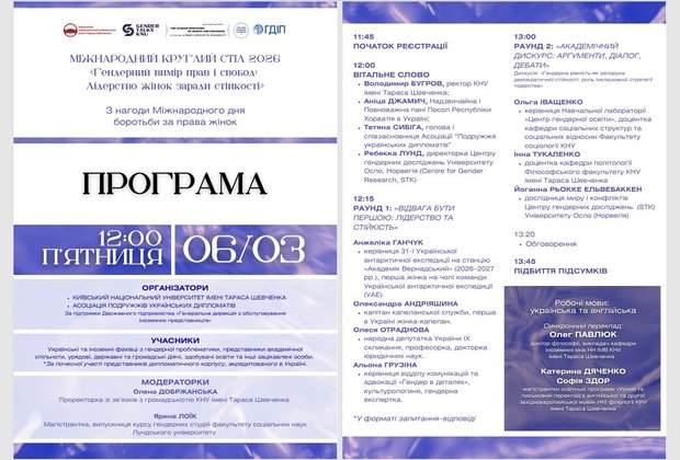 Напередодні Міжнародного дня боротьби за права жінок 6 березня 2026 року у Київському національному університеті імені Тараса Шевченка відбувся Третій міжнародний круглий стіл «Гендерний вимір прав і свобод: лідерство жінок заради стійкості». Захід організовано університетом спільно з Асоціацією подружжів українських дипломатів за підтримки Державного підприємства «Генеральна дирекція з обслуговування іноземних представництв».