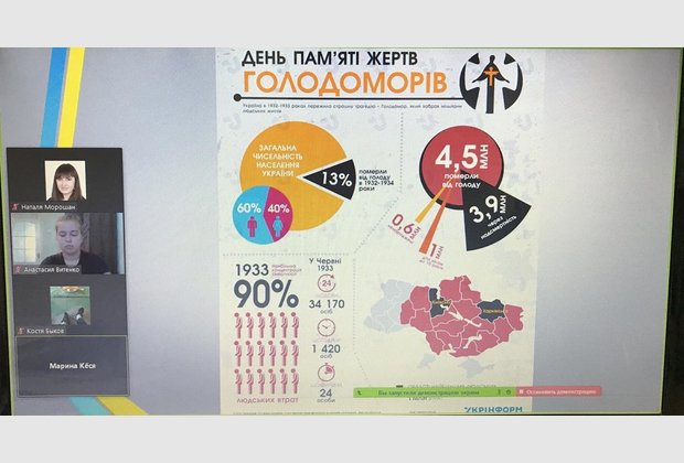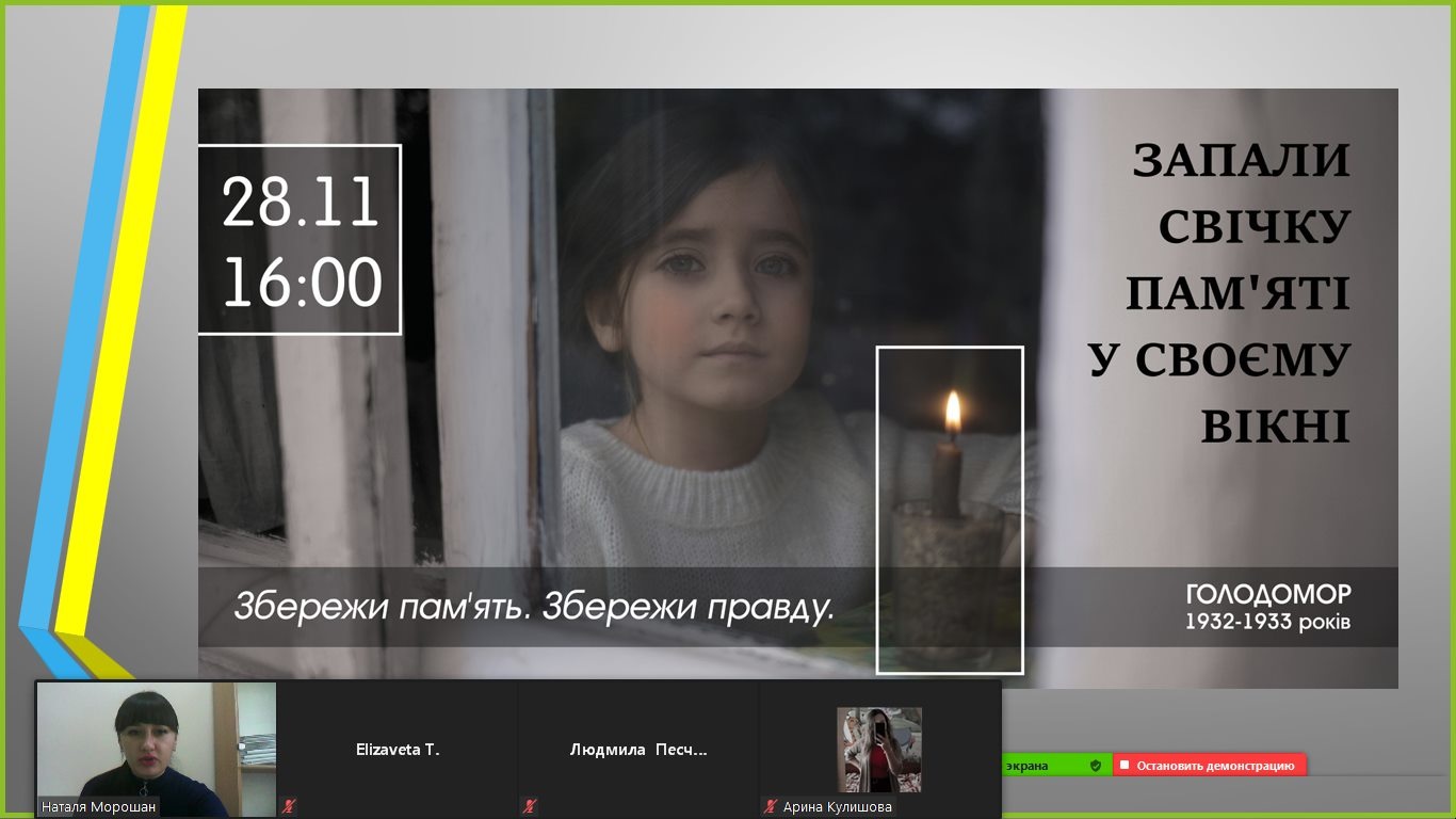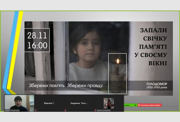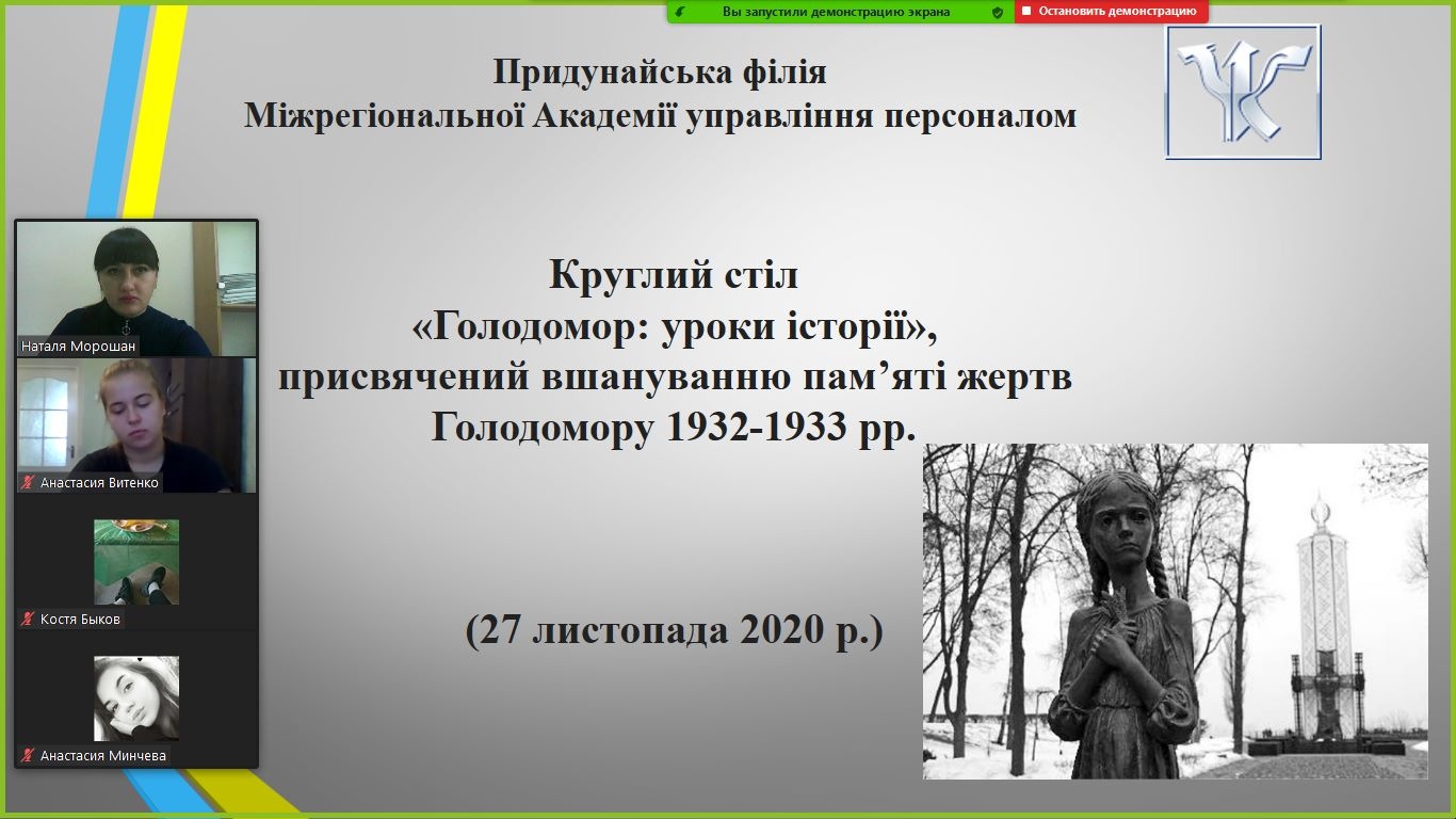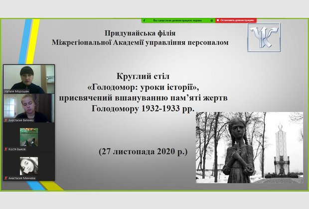 27 листопада 2020 р. в режимі онлайн відбулося засідання круглого столу на тему: «Голодомор: уроки історії», присвячений вшануванню пам’яті жертв Голодомору 1932-1933 рр. (модератор – кандидат історичних наук, викладач кафедри суспільно-наукових дисциплін Н.В.Морошан).
