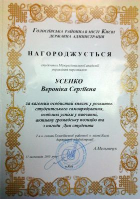Голосіївська РДА нагородила почесною грамотою студентку Академії