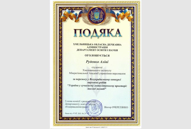 Голова Наукового товариства студентів та молодих вчених Хмельницького інституту МАУП Аліна Руденко розповіла про наукову роботу студентів Інституту та була нагороджена Подякою департаменту освіти та науки Хмельницької обласної державної адміністрації.