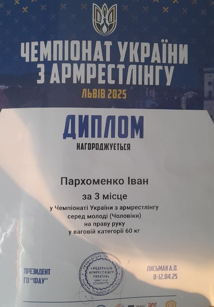 Студент другого курсу Інституту комп’ютерно-інформаційних технологій та дизайну МАУП Пархоменко Іван гідно представив Академію на всеукраїнському рівні. На Чемпіонаті України з армрестлінгу серед молоді (Чоловіки) він виборов третє місце у змаганнях на праву руку у ваговій категорії 60 кг.