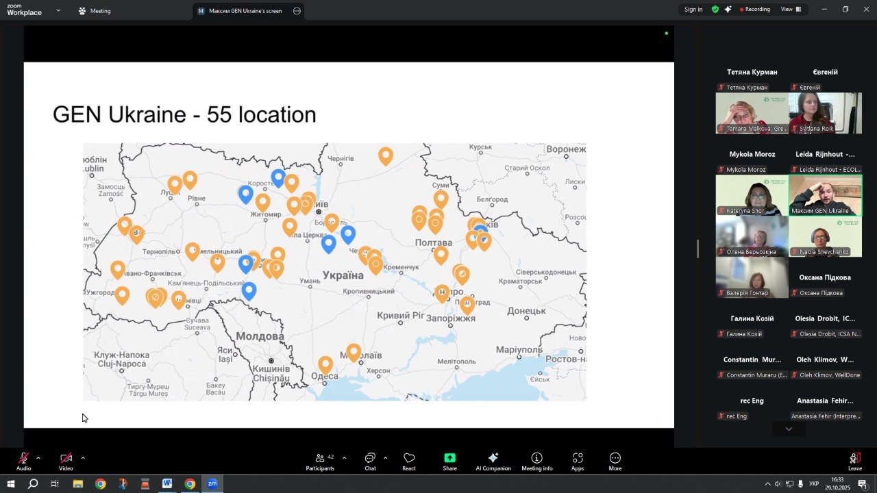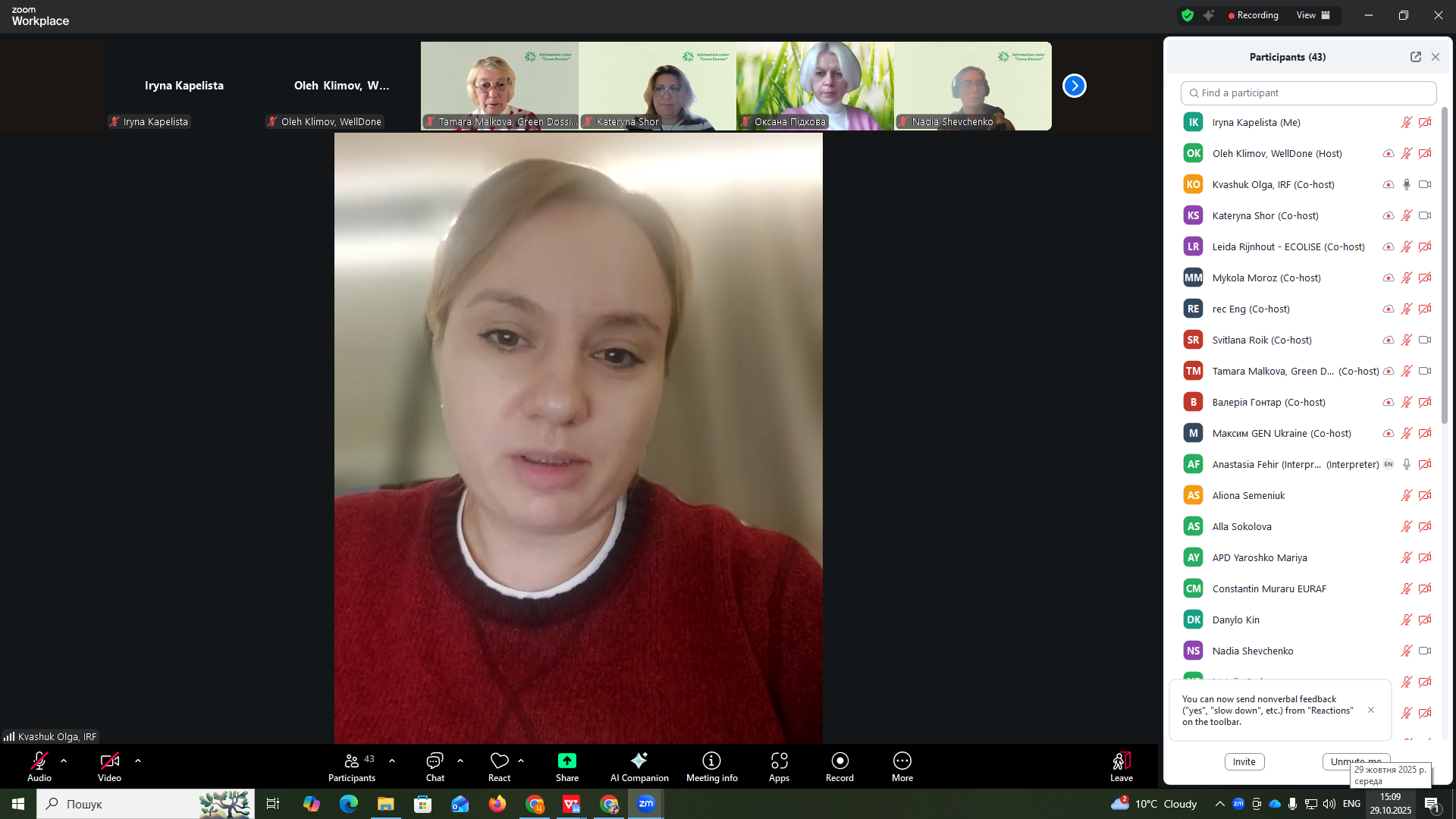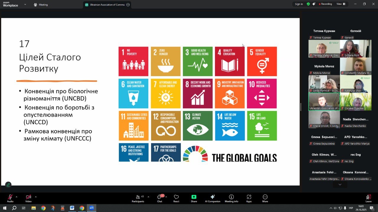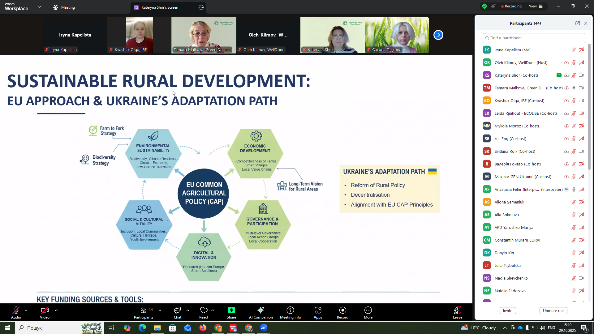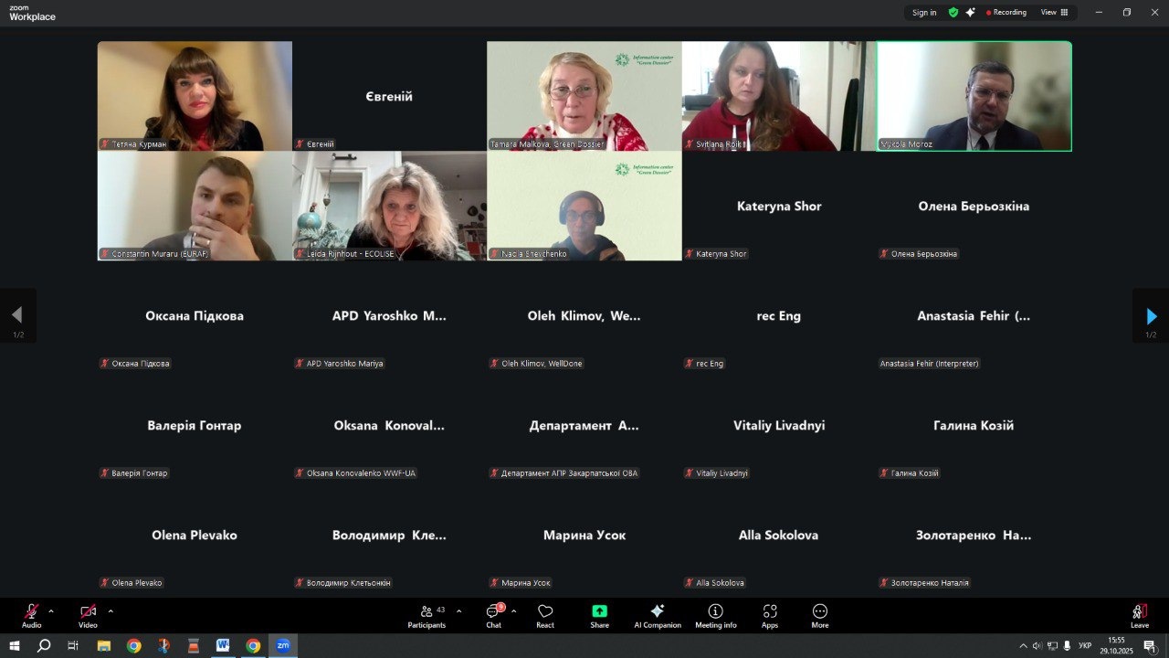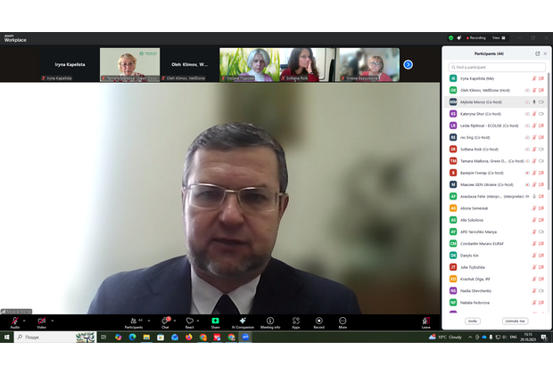 29 жовтня 2025 року працівники Центру організації наукової роботи та інновацій в освітньому процесі Міжрегіональної Академії управління персоналом – Ірина Капеліста, доцент кафедри публічного адміністрування та Євгеній Черняк, здобувач вищої освіти, учасник EcoClub МАУП взяли участь у дискусійному майданчику «Громади та екологічний вимір розвитку сільських територій», який відбувся в онлайн-форматі на платформі Zoom.
