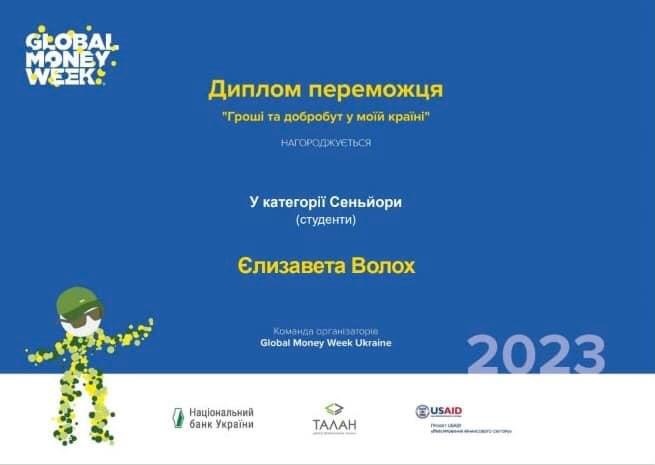 Єлизавета Сергіївна Волох, студентка 3 курсу Навчально-наукового інституту управління, економіки та бізнесу за спеціальністю «Фінанси, банківська справа та страхування» перемогла у конкурсі студентських проектів “Гроші та добробут у моїй країніˮ у рамках Всеукраїнського марафону Національного банку України Тиждень фінансової грамотності Global Money Week 2023.