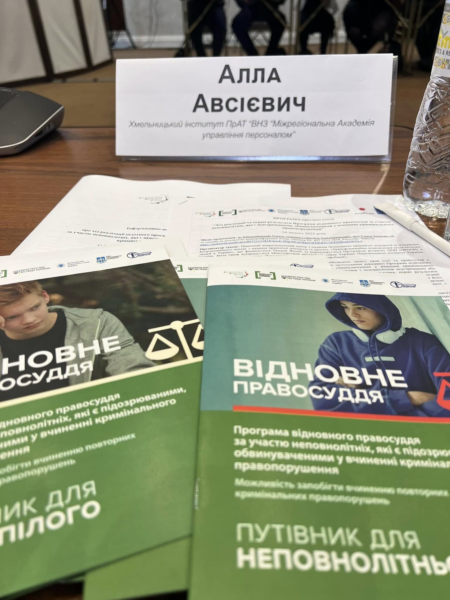 14 лютого 2025 р. у Хмельницькому відбувся круглий стіл, присвячений реалізації Програми відновного правосуддя для неповнолітніх, у якому взяли участь представники Північного міжрегіонального центру з надання безоплатної правничої допомоги, прокурори Хмельницької обласної прокуратури та Кам’янець-Подільської окружної прокуратури, представники Управління дотримання прав людини Департаменту головної інспекції та дотримання прав людини Національної поліції України, психологи ДУ «Центр пробації» у Хмельницькій області, адвокати, медіатори тощо. Хмельницький інститут МАУП представляла доцент кафедри права та правоохоронної діяльності Алла Авсієвич.