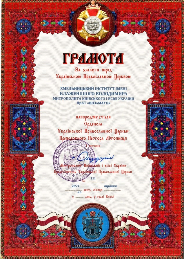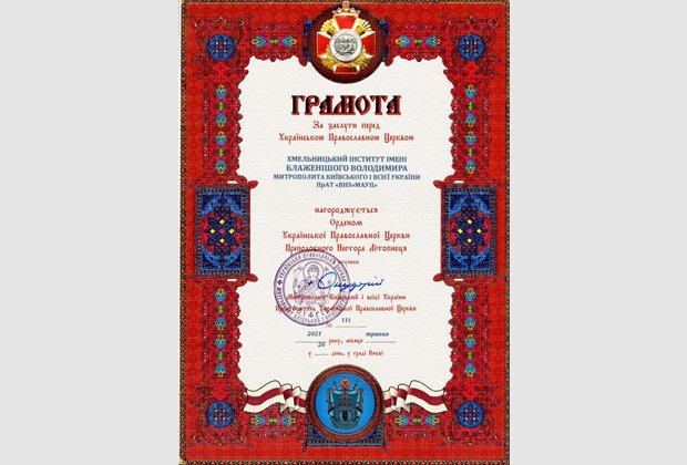Хмельницький інститут названо на честь нашого земляка Блаженнішого Митрополита Володимира.