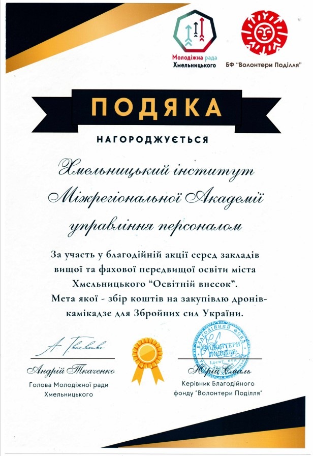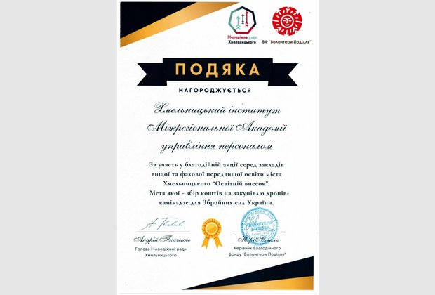 За участь у акції колективу Хмельницького інституту МАУП оголошено подяку від Молодіжної ради Хмельницького та БФ «Волонтери «Поділля»!.