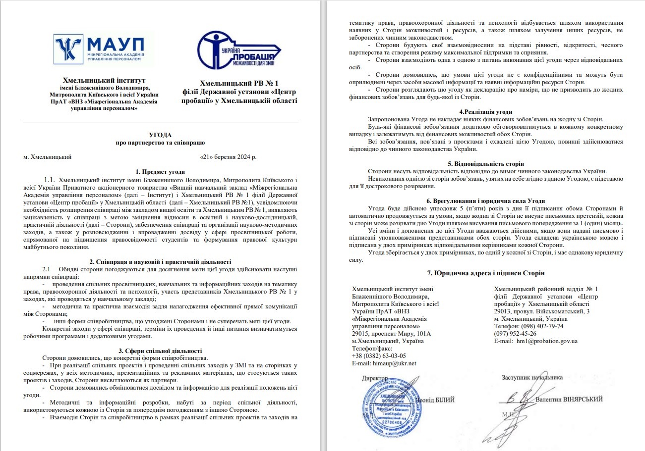 Відбулося підписання угоди про партнерство і співпрацю між Хмельницьким інститутом МАУП та філією Державної установи «Центр пробації» у Хмельницькій області
