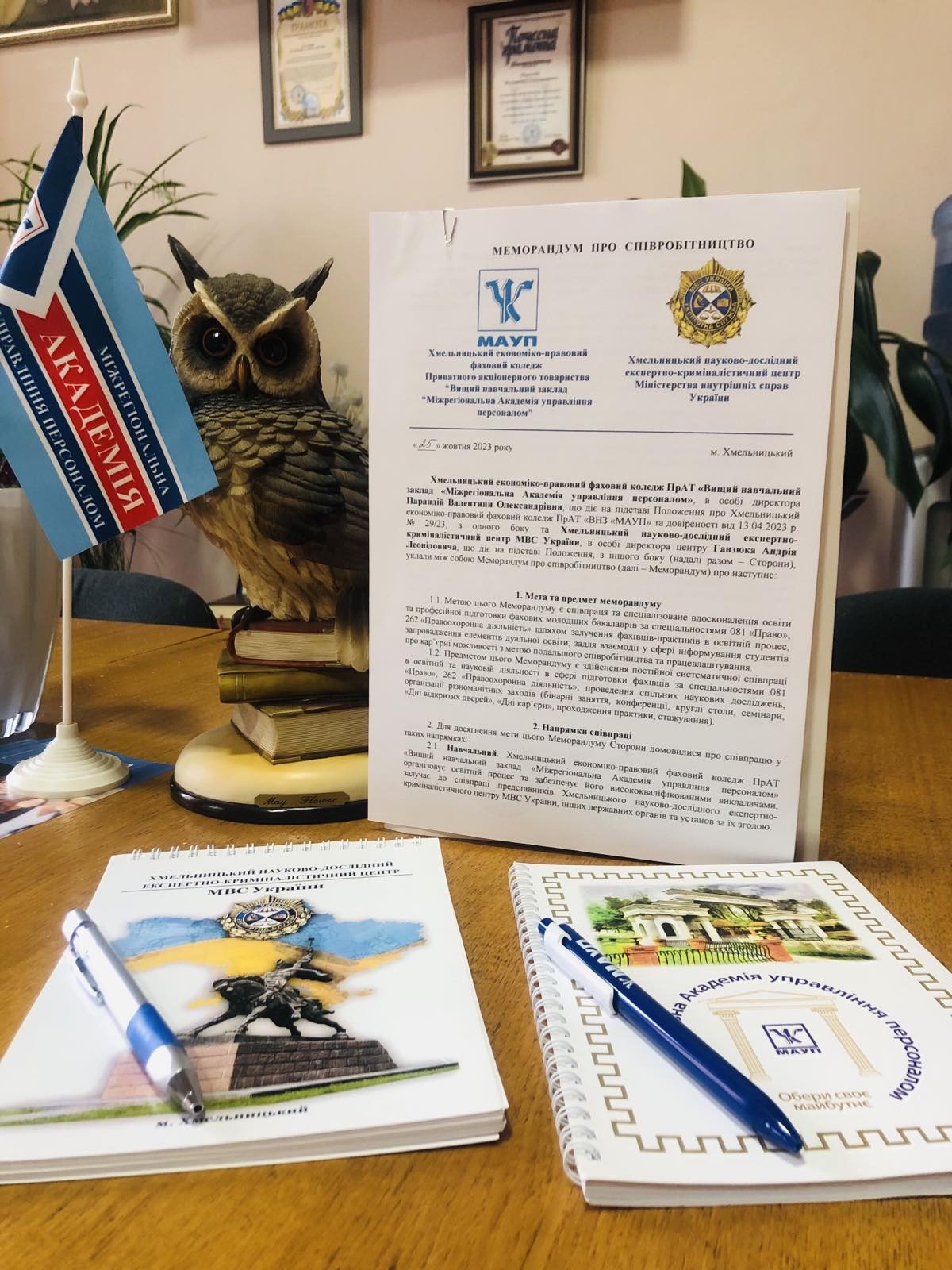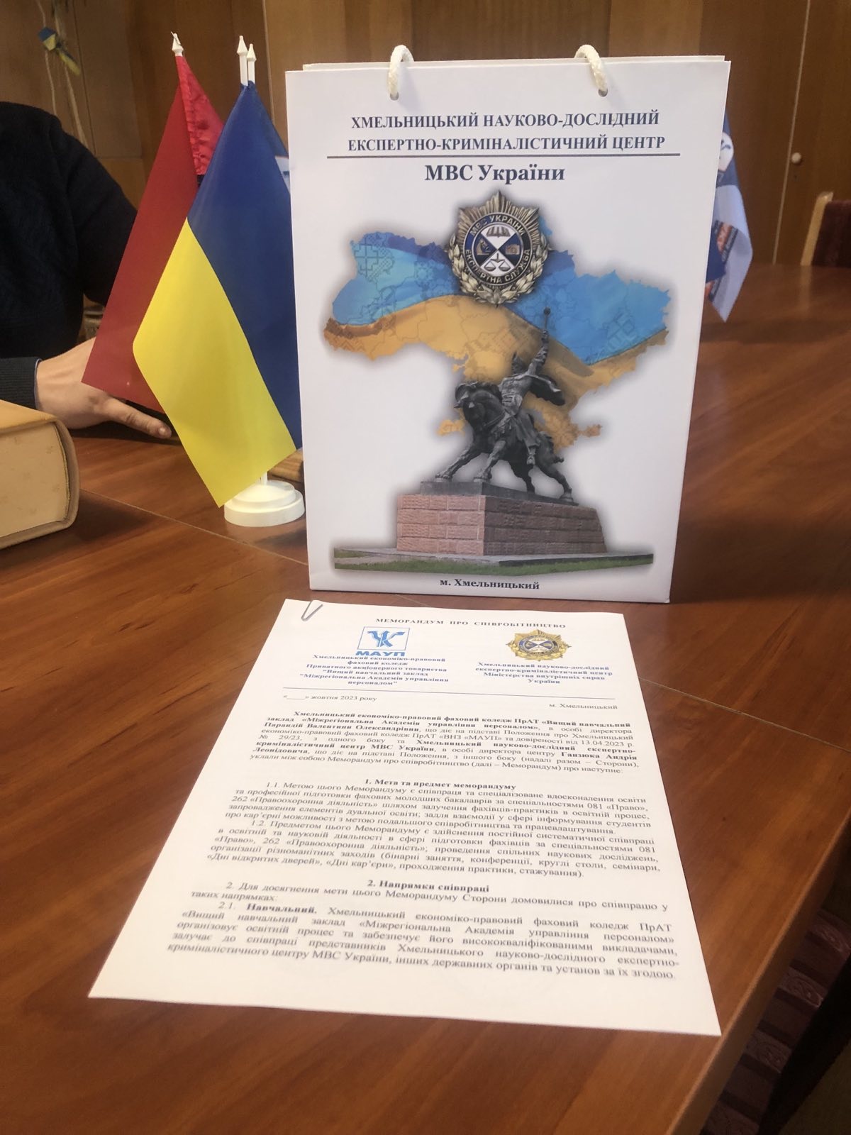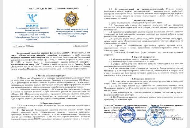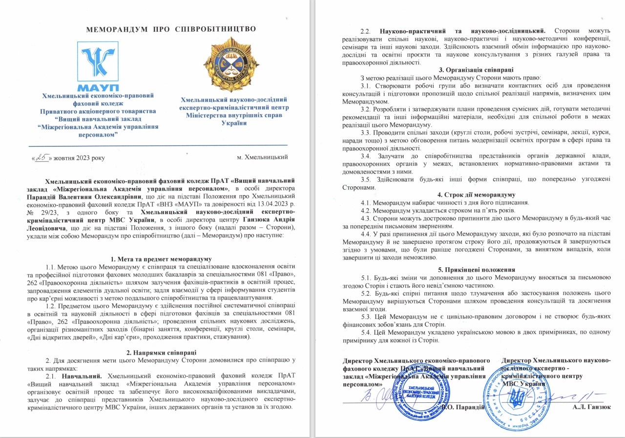 Підписано Меморандум про співробітництво між Хмельницьким економіко-правовим фаховим коледжем МАУП та Хмельницьким науково-дослідним експертно-криміналістичним центром МВС України