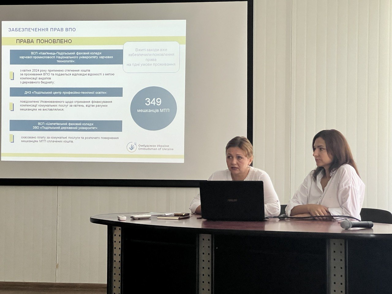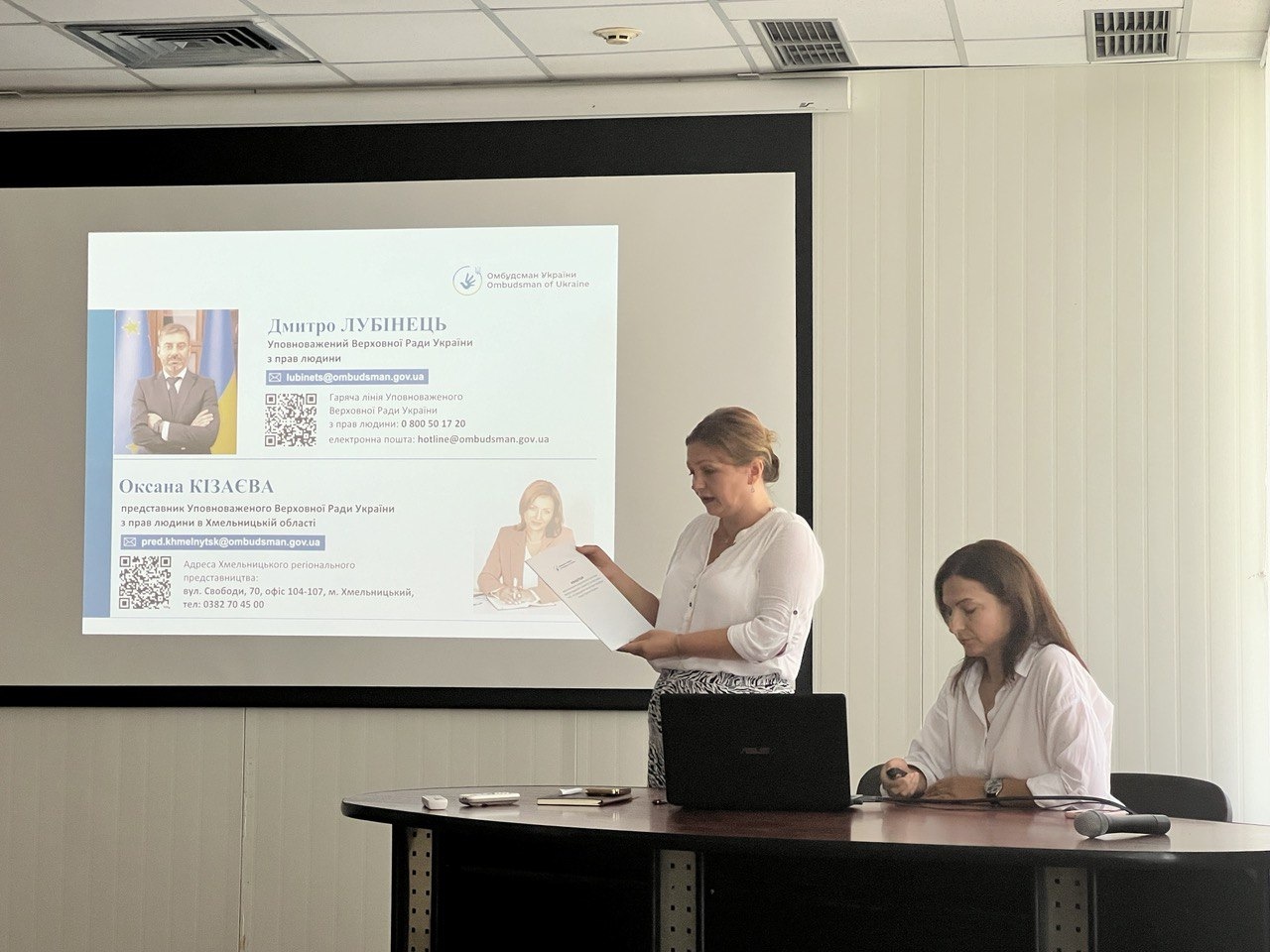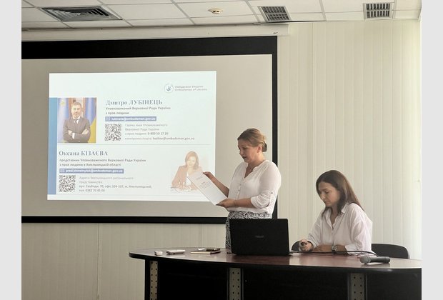 Представник Уповноваженого Верховної Ради України з прав людини в Хмельницькій області Оксана Кізаєва ознайомила учасників заходу із основними напрямками роботи Офісу Омбудсмана і регіонального представництва в сфері захисту прав громадян, постраждалих внаслідок збройної агресії та поділилася практичним досвідом вирішення проблемних питань ВПО. Також Оксана Кізаєва повідомила присутніх про представлену Офісом Омбудсмана Концепцію вдосконалення національної системи засобів правового захисту та підтримки осіб, постраждалих внаслідок збройної агресії проти України, яка базується, зокрема, на принципі необхідності повного відшкодування нанесеної шкоди.