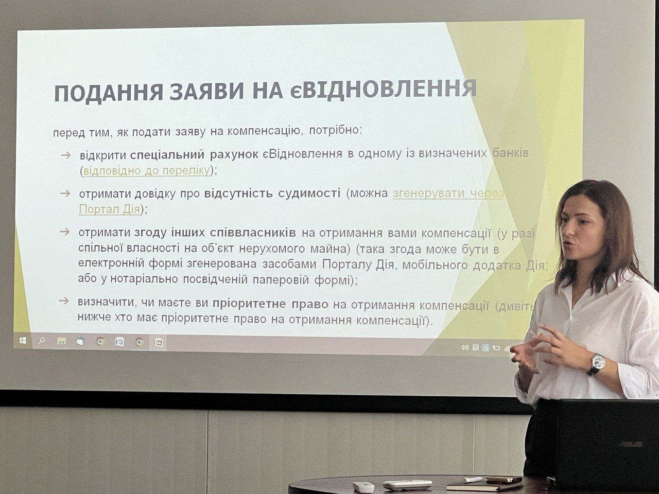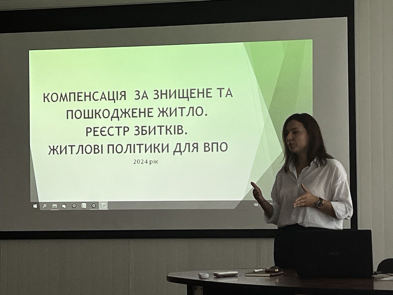 В подальшому Ольга Галюк з учасниками тренінгу детально обговорила питання механізму компенсації за знищене та зруйноване майно, проблемні аспекти механізму, різниці між Реєстром збитків та Реєстром пошкодженого майна та житлові політики. Жваву дискусію викликало питання, що стосується Програми доступного кредитування житла “єОселя”.
