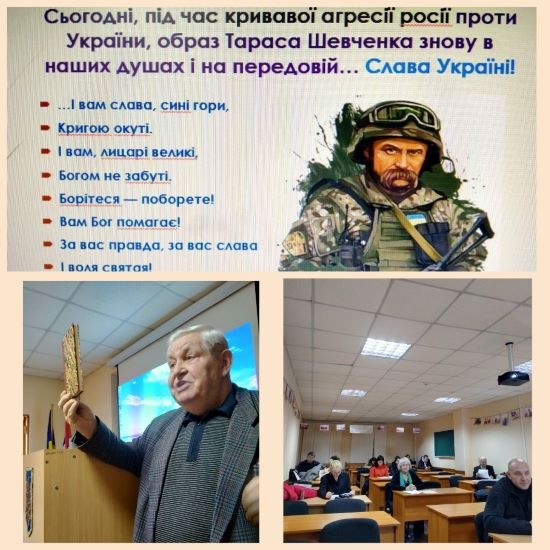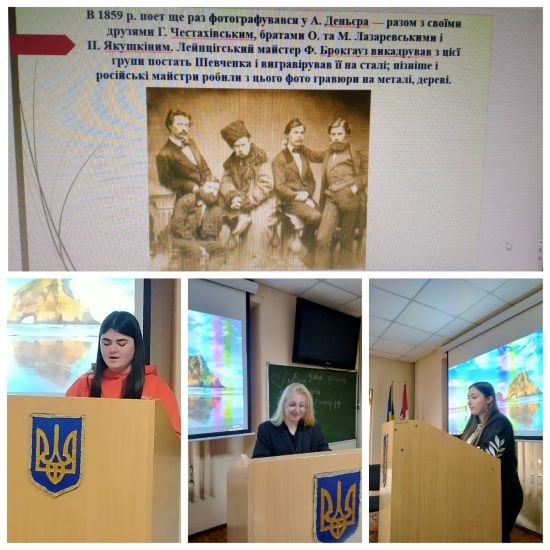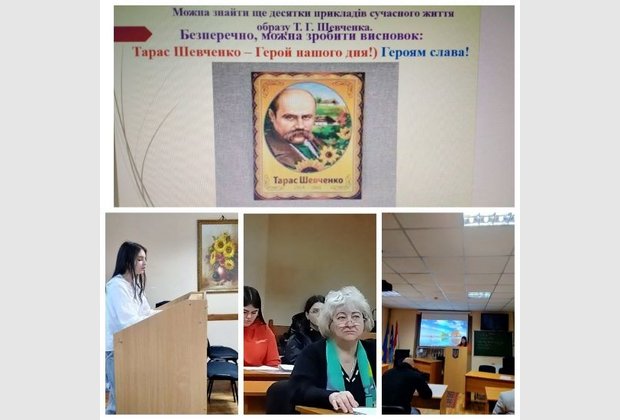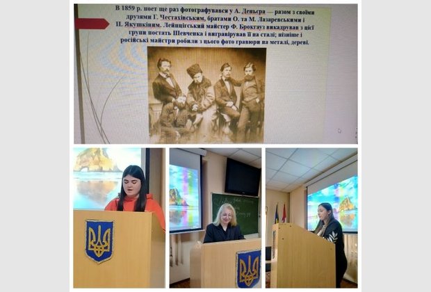 З основною доповіддю "Сторінками життя Т. Г. Шевченка" виступив к.і.н., доц., професор кафедри правових дисциплін Олексій Домбровський. Про історичні мотиви в творах Т.Шевченка доповіла к.і.н., доц., професор кафедри загальнонаукових, соціальних та поведінкових дисциплін Лариса Домбровська. Цікаву презентацію "Тарас Шевченко в фотографіях та малюнках" представила доцент кафедри правових дисциплін Олена Золотарьова. Студенти-члени студентських наукових Клубів Аліна Паладе, Вікторія Терзі, Наталя Воронко, Ліка Оставненко за допомогою технічного супроводу студента Микити Мажари презентували питання творчості Т.Г.Шевченка в оцінці діячів зарубіжної культури, розкриття образу матері, краси української природи, таланту Шевченка як художника і гравера.