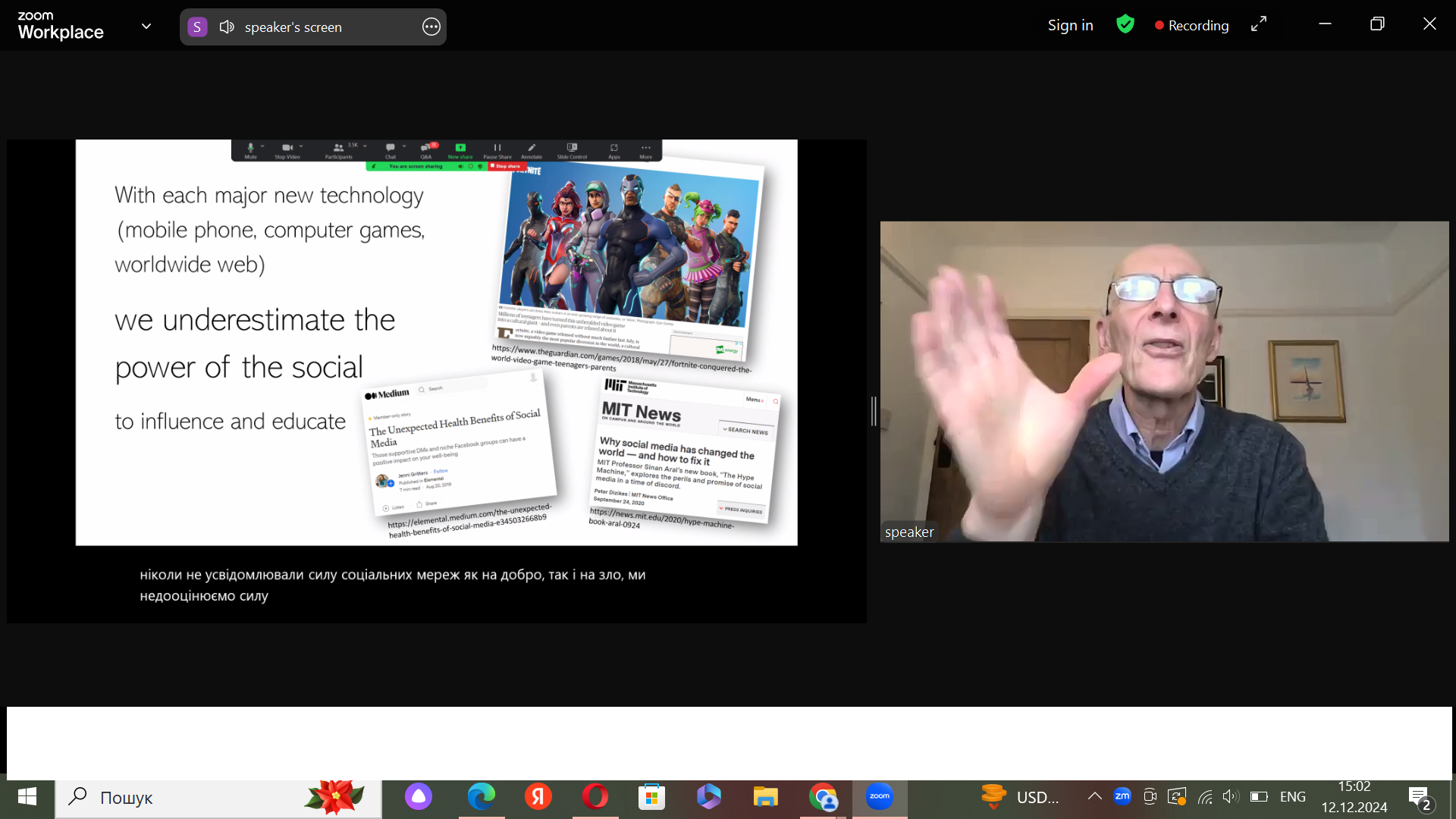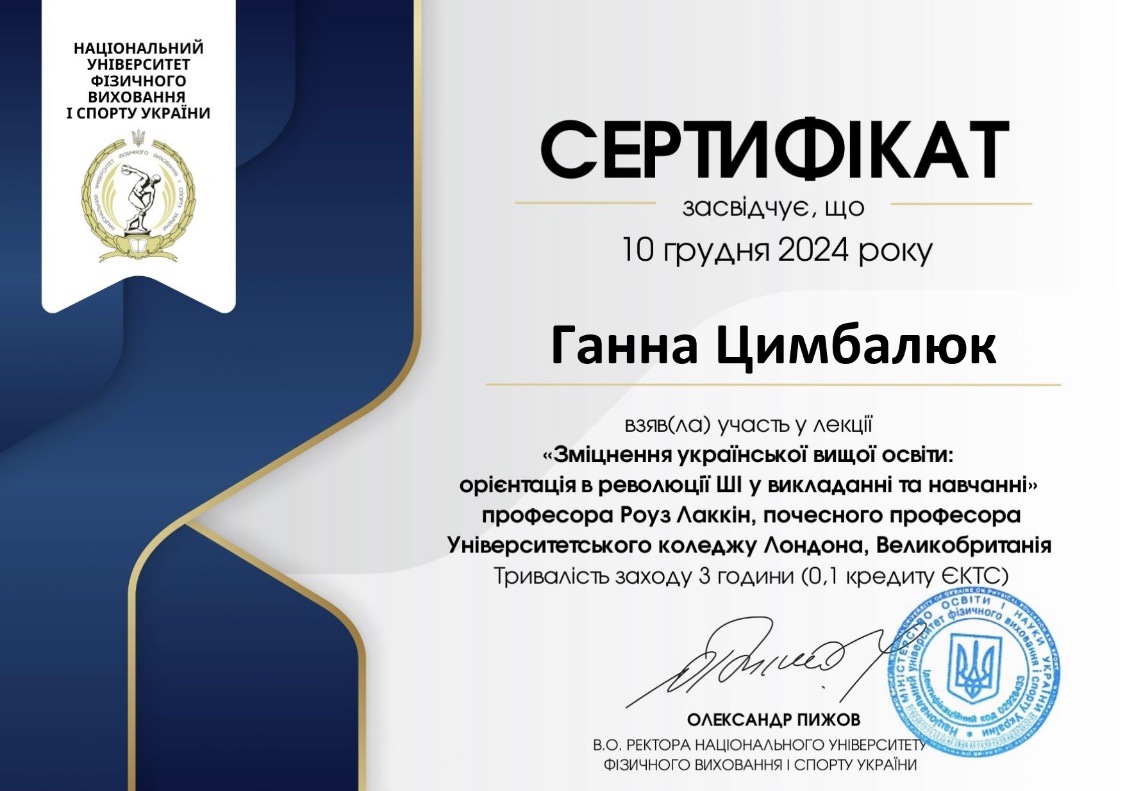 Спікер: професор Майк Шарплз, почесний професор Інституту освіти Відкритого університету, Великобританія, який розглянув як генеративний ШІ, зокрема ChatGPT, змінює освіту, виконуючи завдання від написання есе до створення планів занять і ведення діалогів. Лекція охопила виклики, такі як розпізнавання робіт, створених ШІ, розробка політик для його використання в освіті, а також програми «ШІ-грамотності» для викладачів і студентів. Професор також представив можливості ШІ у викладанні й оцінюванні, зокрема моделей як «Двигун можливостей», «Опонент Сократа», «Співрозробник» і «Динамічний оцінювач».