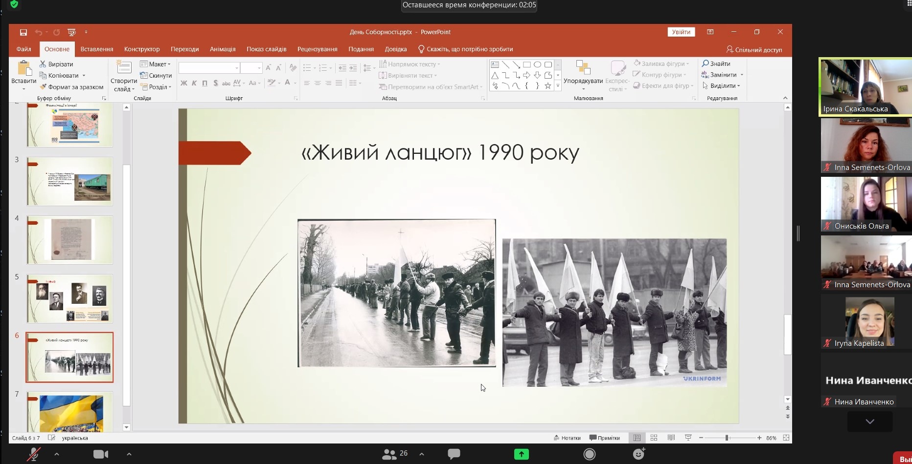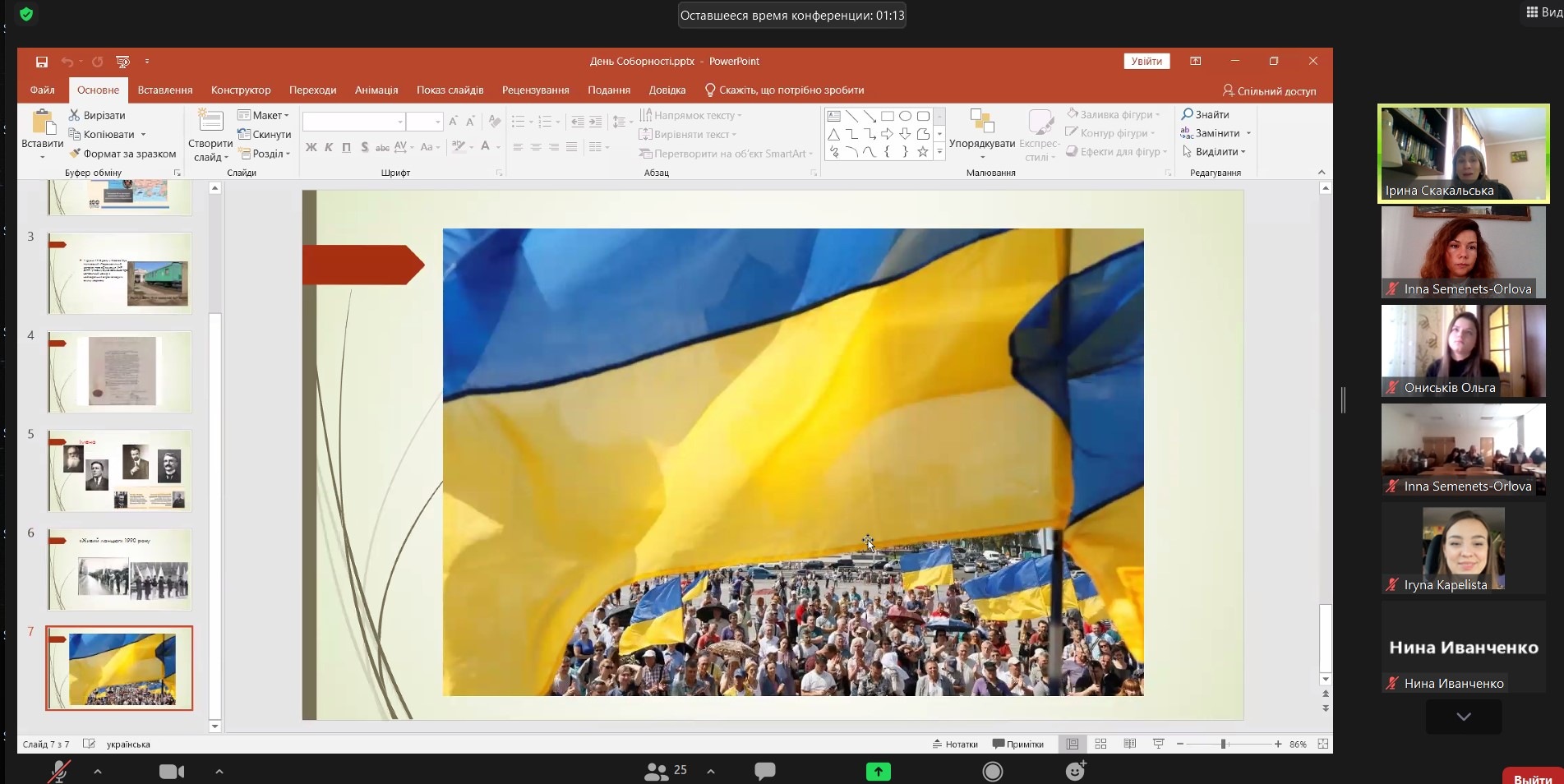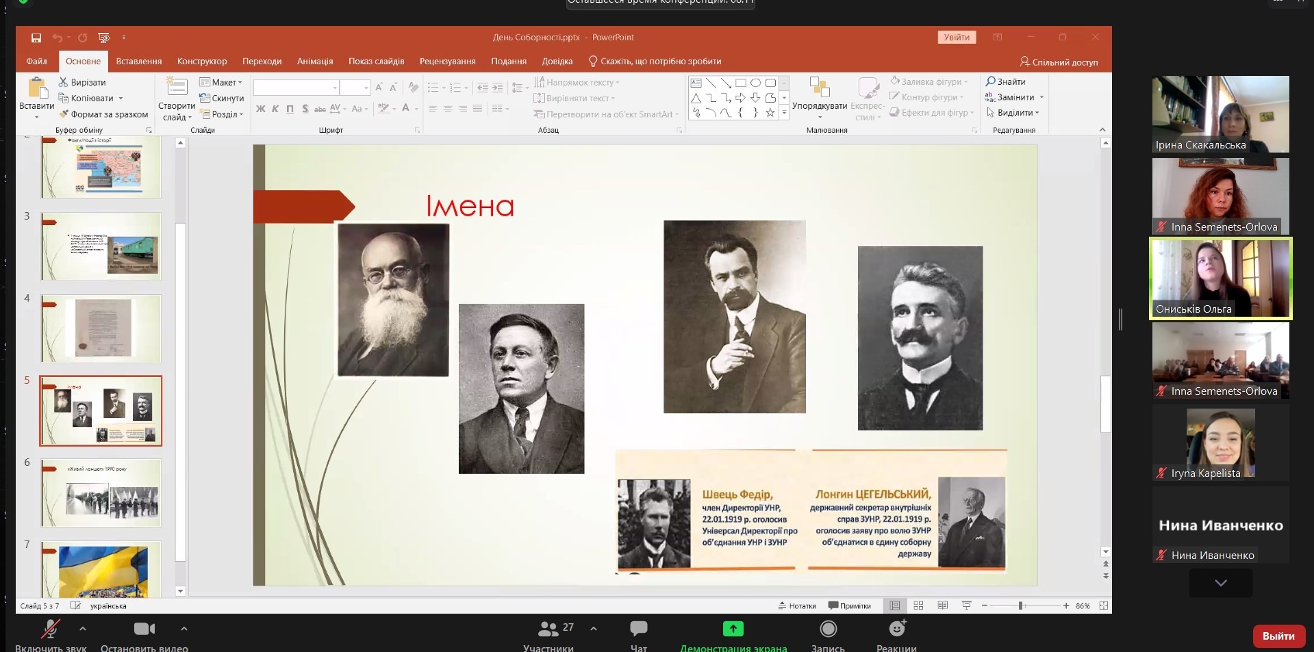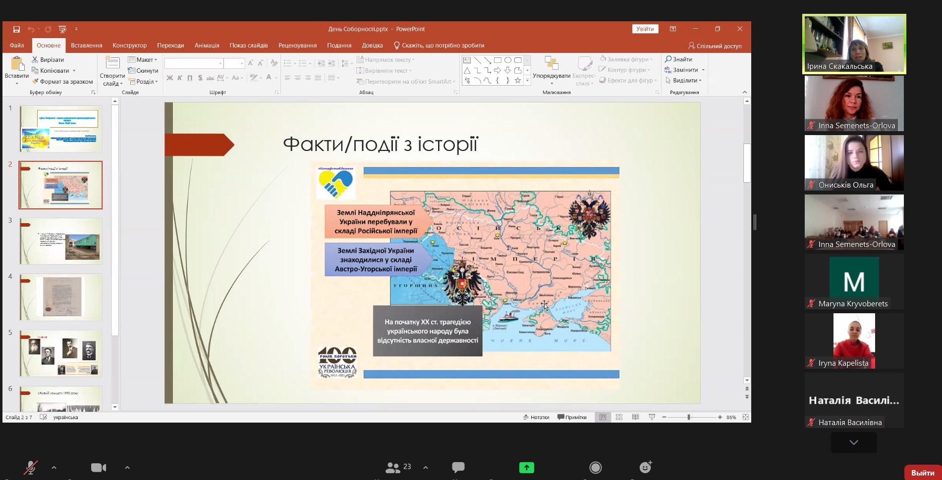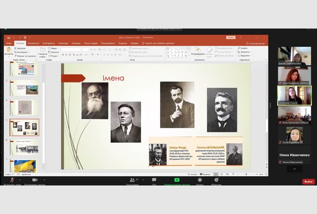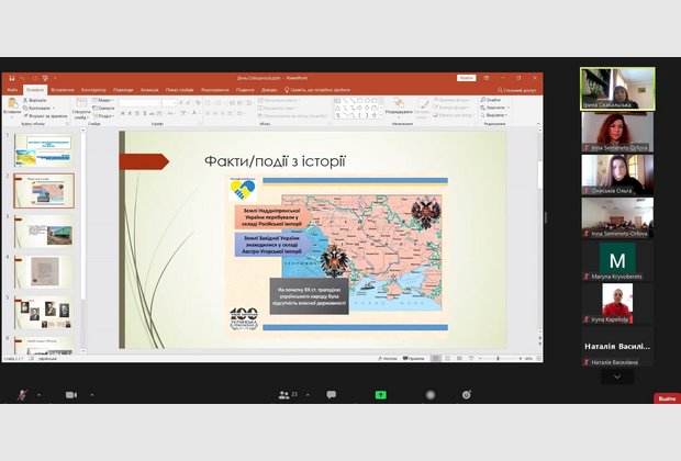 20 січня онлайн-журнал сторінками історії і сьогодення на тему "День Соборності ‒ символ національного єднання Українського народу. Факти. Події. Імена" для студентського та викладацького колективу ННІУЕБ провела доктор історичний наук, професор, відомий краєзнавець Ірина Богданівна Скакальська. Ведуча наголосила на важливості єднання Українського народу в умовах гібридного протистояння, проаналізувала значення окремих персоналій у історичних подіях початку ХХ століття. Акт Злуки 22 січня 1919 року увінчав соборницькі прагнення українців щонайменше з середини XIX століття. Ідея соборності України була ключовою для наступного покоління учасників українського визвольного руху у XX столітті, насьогодні має надважливе історичне значення для розбудови суверенної Української держави.