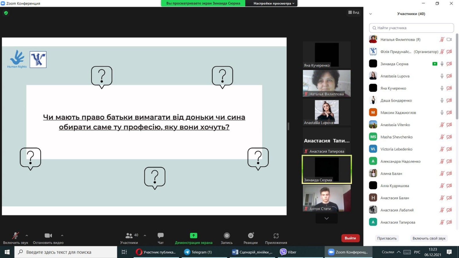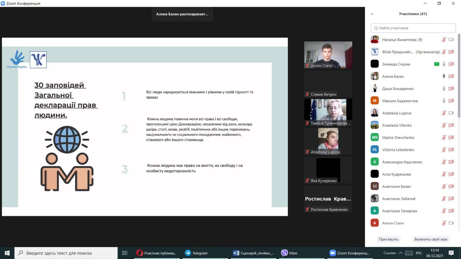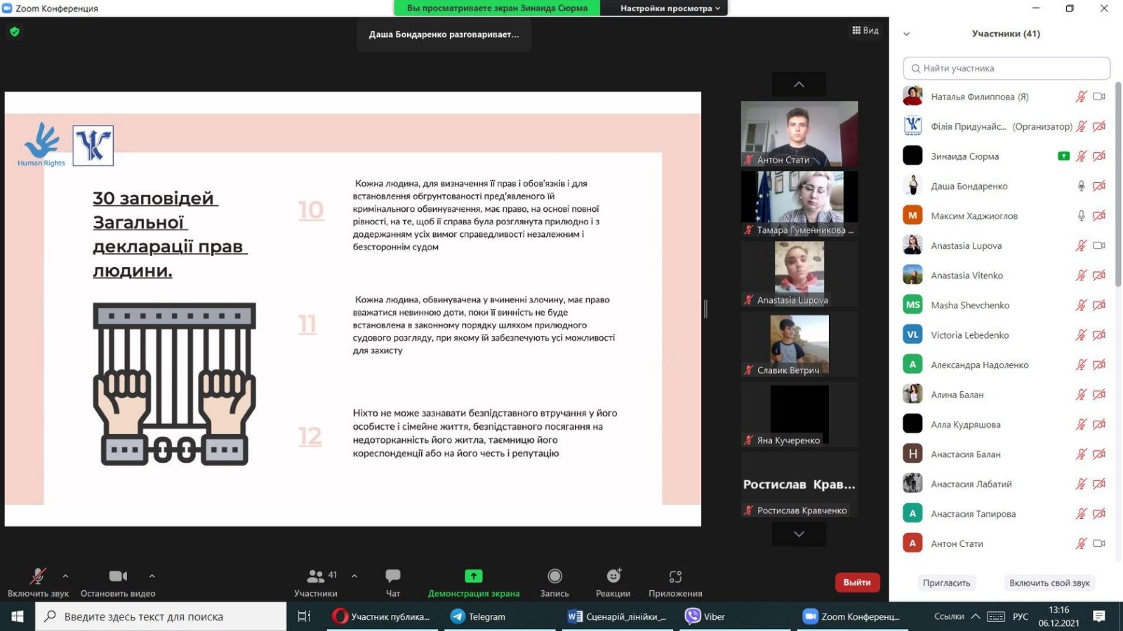 Мета заходу: поглиблення знань здобувачів вищої освіти про права та обов’язки людини і громадянина, які закріплені в Загальній Декларації прав людини та в Конституції України.