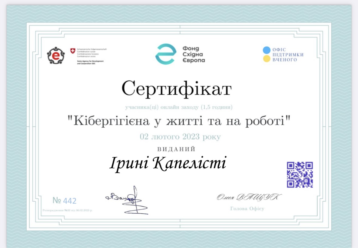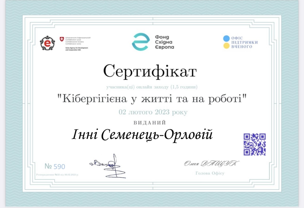 2 лютого 2023 року викладачі Навчально-науковий інститут управління, економіки та бізнесу взяли участь в онлайн заході «Кібергігієна у житті та на роботі». Захід організовано Офісом підтримки вченого у партнерстві з Фондом Східна Європа.