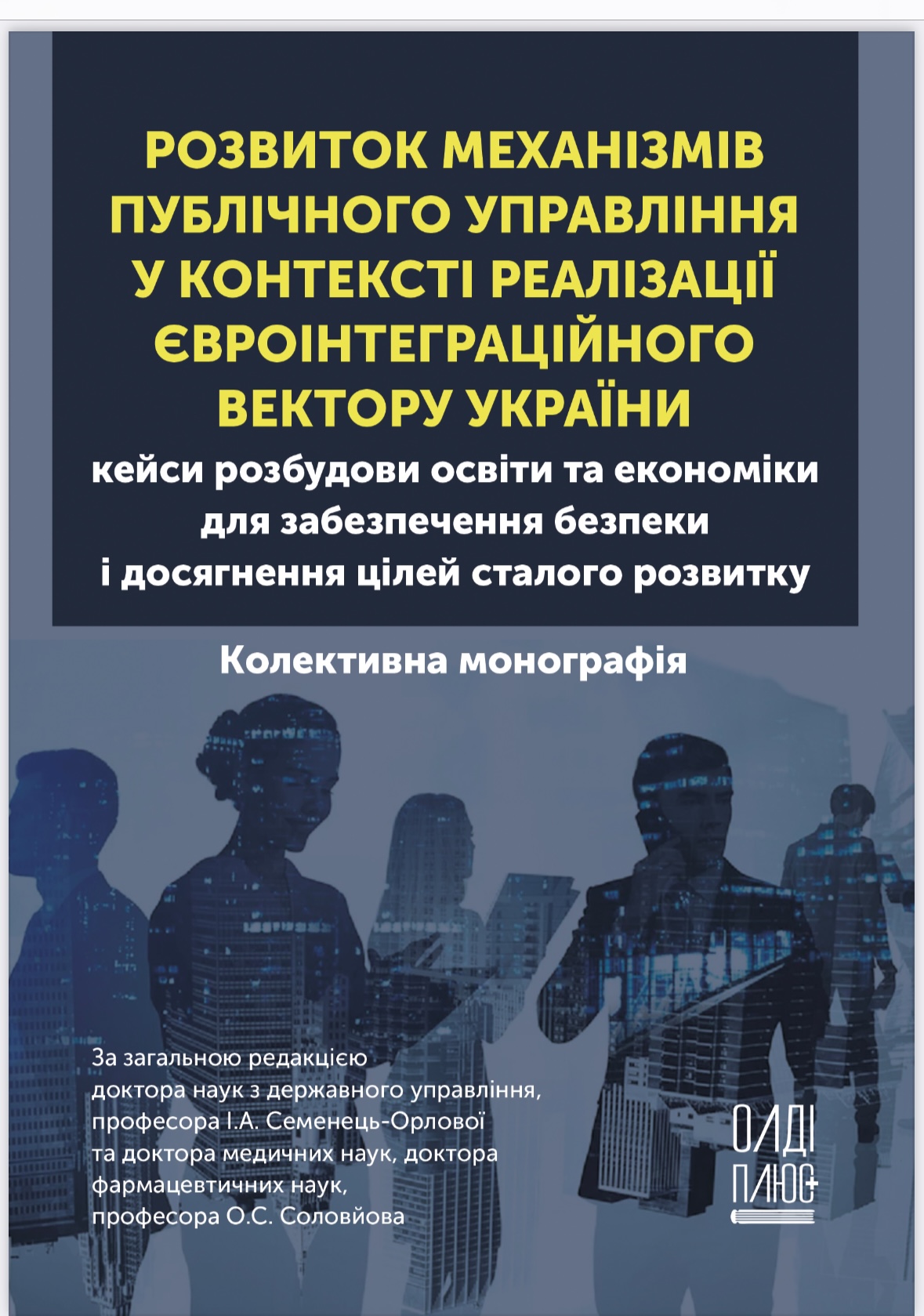 Вийшла друком колективна монографія: «Розвиток механізмів публічного управління в контексті реалізації євроінтеграційного вектора України (кейси розбудови освіти та економіки для забезпечення безпеки й досягнення цілей сталого розвитку) : монографія / за заг. ред. доктора наук з державного управління, професора І. А. Семенець-Орлової та доктора медичних наук, доктора фармацевтичних наук, професора О. С. Соловйова».